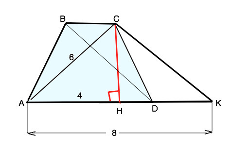 Способ 2). Проведем из вершины С параллельно диагонали ВD прямую до пересечения с продолжением АD в точке К. Четырехугольник DBCK- параллелограмм (противолежащие стороны параллельны), DK=BC и АК=ВС+AD=2•4=8(т.к. равно двум полусуммам оснований). Тогда площадь треугольника равна АСК равна площади трапеции, её можно вычислить по ф.Герона и получить тот же результат.
