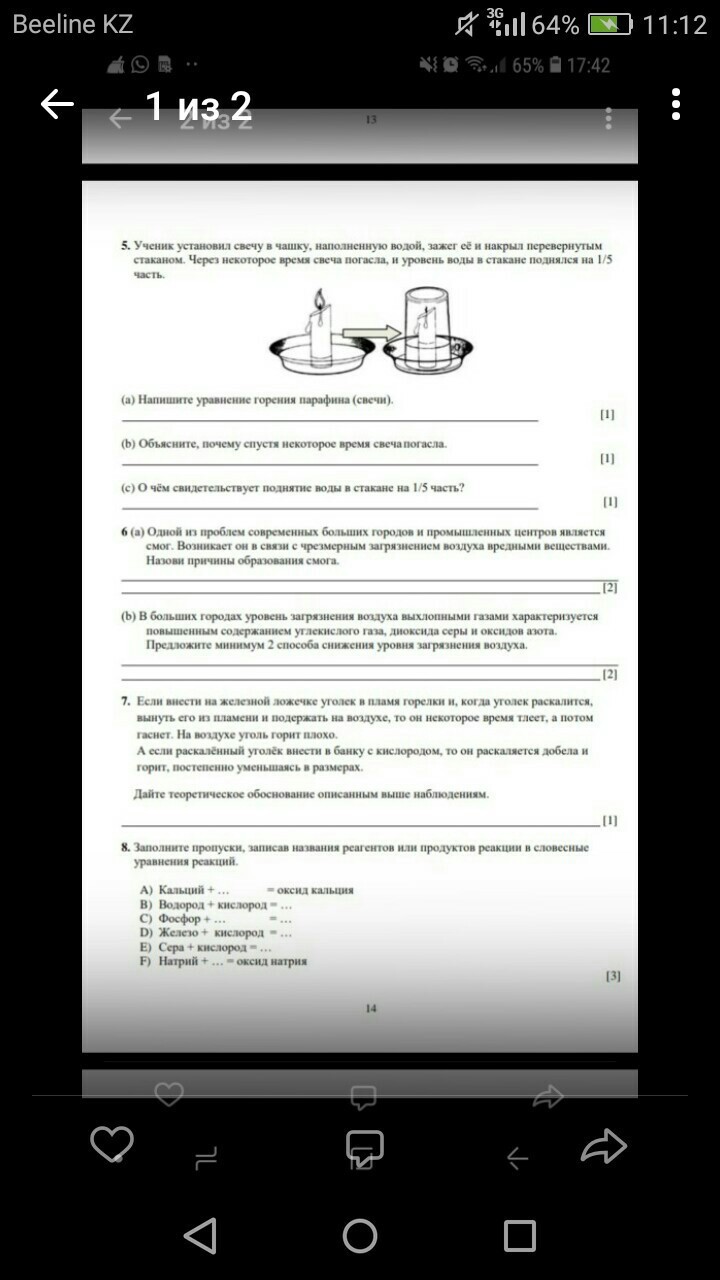 5 а) не знаю 5 б ) потому что нет доступа кислорода 5 с) так как при горении фосфора расходуется только кислород .Газ , оставшиеся под стаканчиком, - азот, он в реакцию не вступает 6 а ) причины : выхлопные газы машин заводов фабрик и сжигание костров 6 б) с помощью специальных фильтров 7 не знаю 8 а )кальций + кислород = оксид кальция В) водород +кислород=оксид водорода С) фосфор+кислород=оксид фосфора D) железо+кислород=железная окалина Е) сера+кислород=оксид серы F)натрий+кислород=оксид натрия