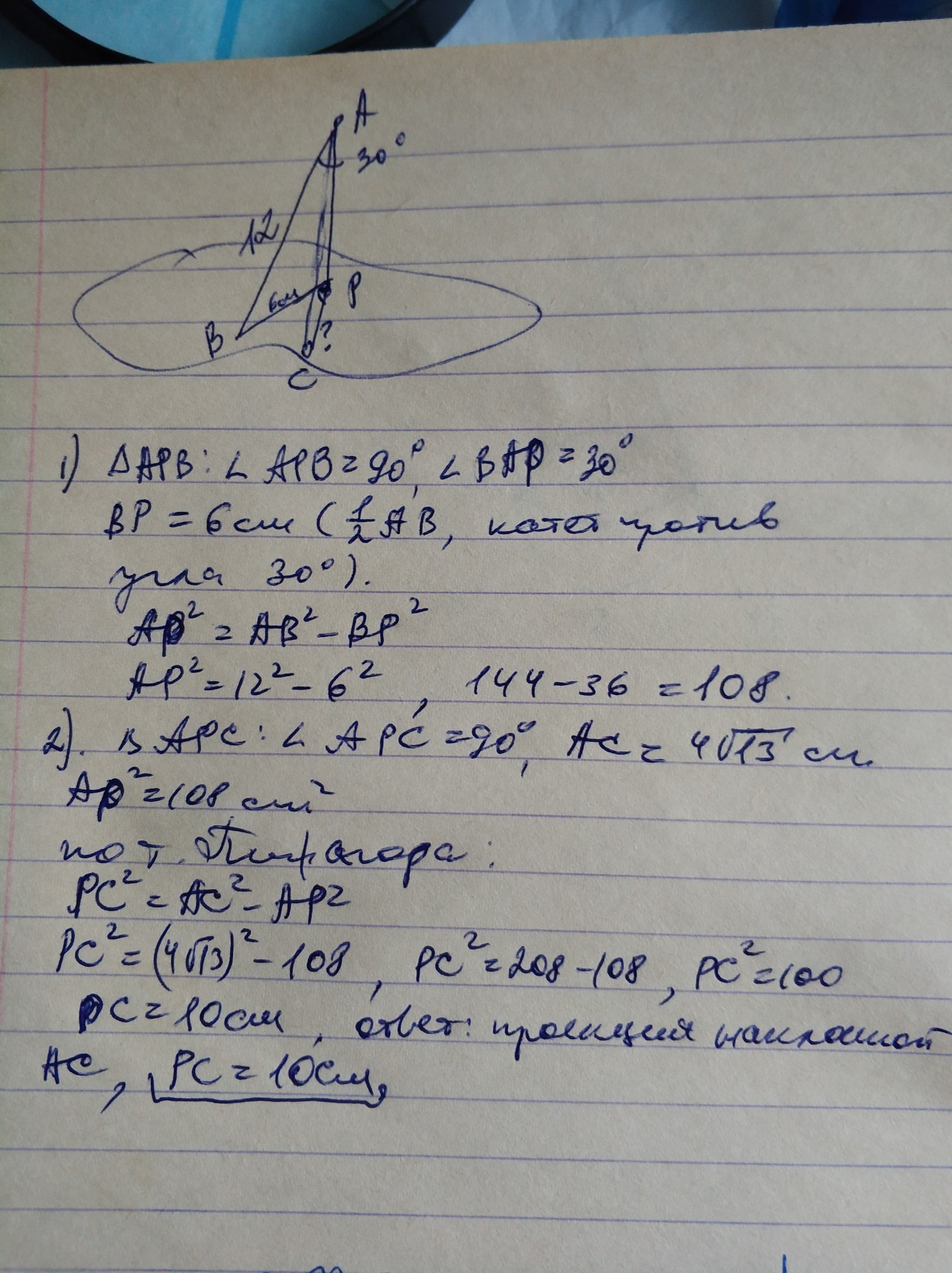 Із точки А до площини альфа проведено перпендикуляр АР і похилі АВ і АС. Знайдіть проекію похилої АС, якщо АВ = 12см, АС= 4√13см, кут ВАР=30°