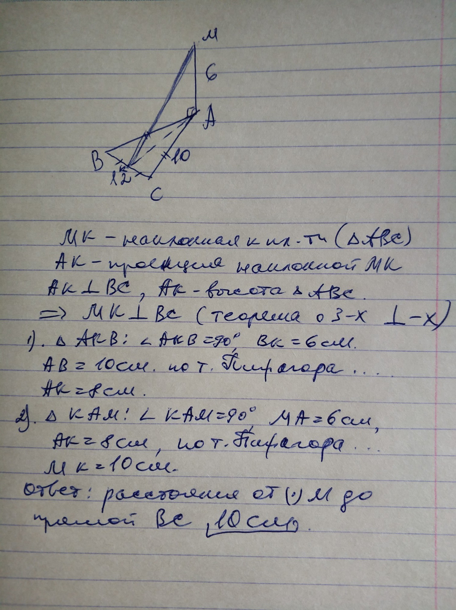 Відрізок АМ перпендикулярний до площини трикутника АВС. Обчисліть відстань від точки М до прямої ВС, якщо МА=6см, АВ=АС=10см, ВС=12см