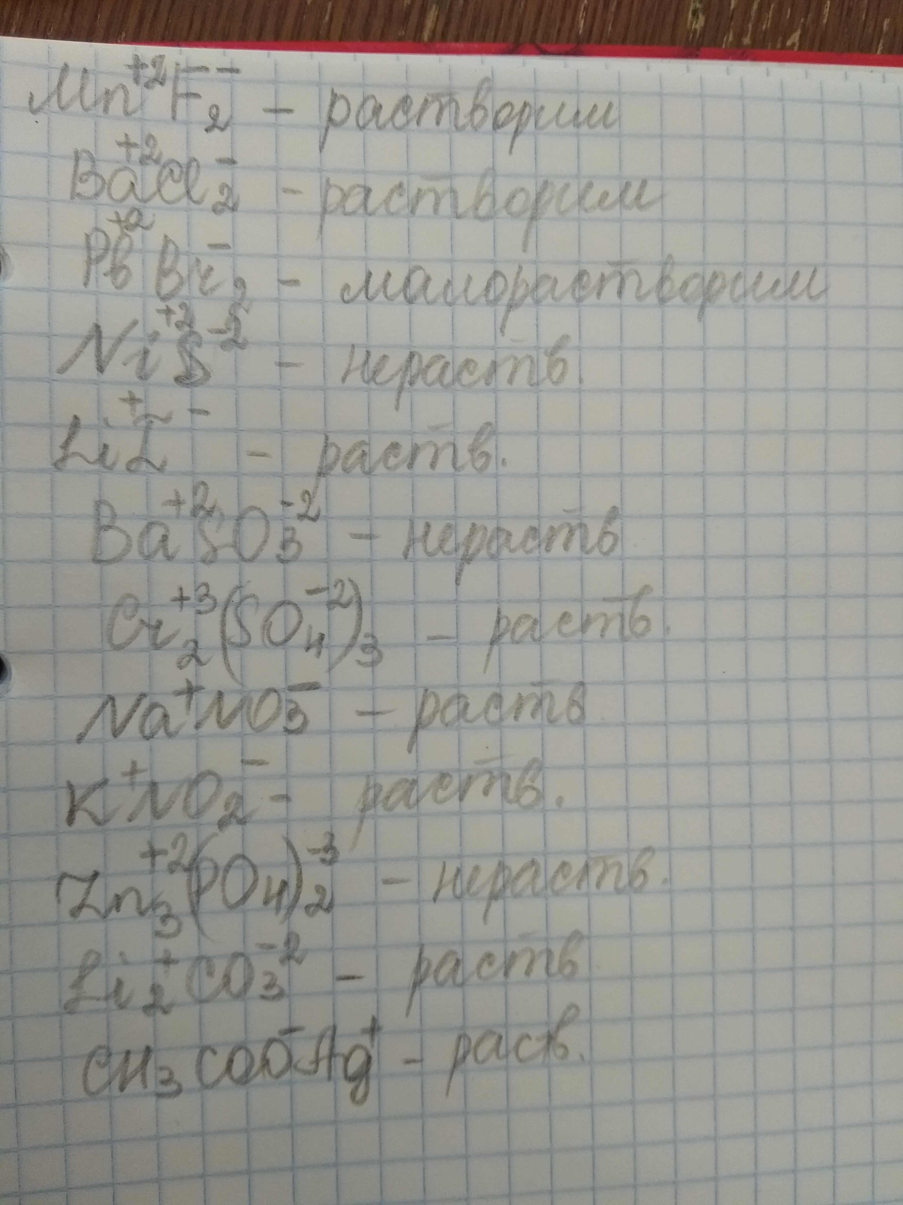 Определить степень окисления и растворимость элементов:Фторид марганца(||),Хлорид бария,бромид свинца,иоид лития,сульфид никеля,сульфит бария,сульфат хрома(|||),нитрат натрия,нитрит калия,фосфат цинка,карбонат лития,ацетат серебра