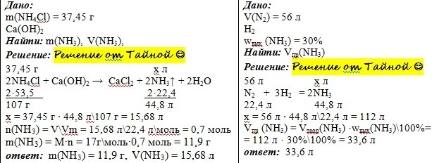 2) Вычислите объем аммиака (н.у.), который может быть получен в реакции 56 л азота с водородом, если выход продукта составляет 30%