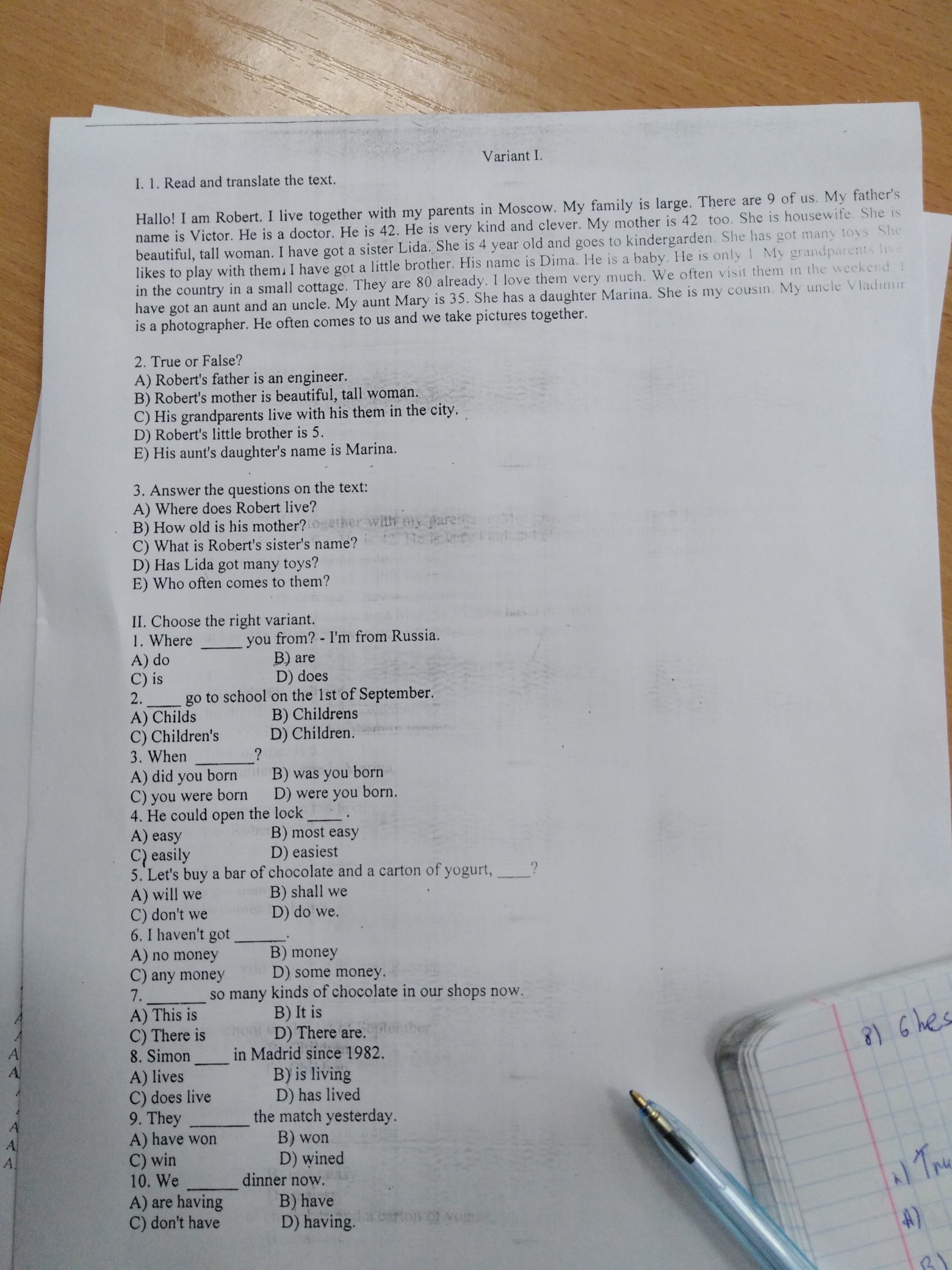Привет, я Роберт. Я живу вместе со своими родителями в Москве. Моя семья большая. В нашей семье 9 человек. Моего папу зовут Виктор. Он доктор. Ему 42 года. Он очень добрый и умный. Моей маме тоже 42 года. Она домработница. Она красивая,высокая женщина. У меня есть сестра Линда. Ей 4 года и она идёт в детский сад. У нее много игрушек. Она любит играть с ними. У меня есть младший брат Дима. Она младенец. Мои бабушка и дедушка живут в деревне в маленьком коттедже. Им уже 80 лет. Я люблю их очень сильно. Мы часто навещаем их на выходных. У меня есть тетя и дядя. Моя тетя Мари ей 35. У нее есть дочь Марина. Она моя двоюродная сестра. Мой дядя Владимир он фотограф. Он часто приходит к нам и мы фотографируем вместе