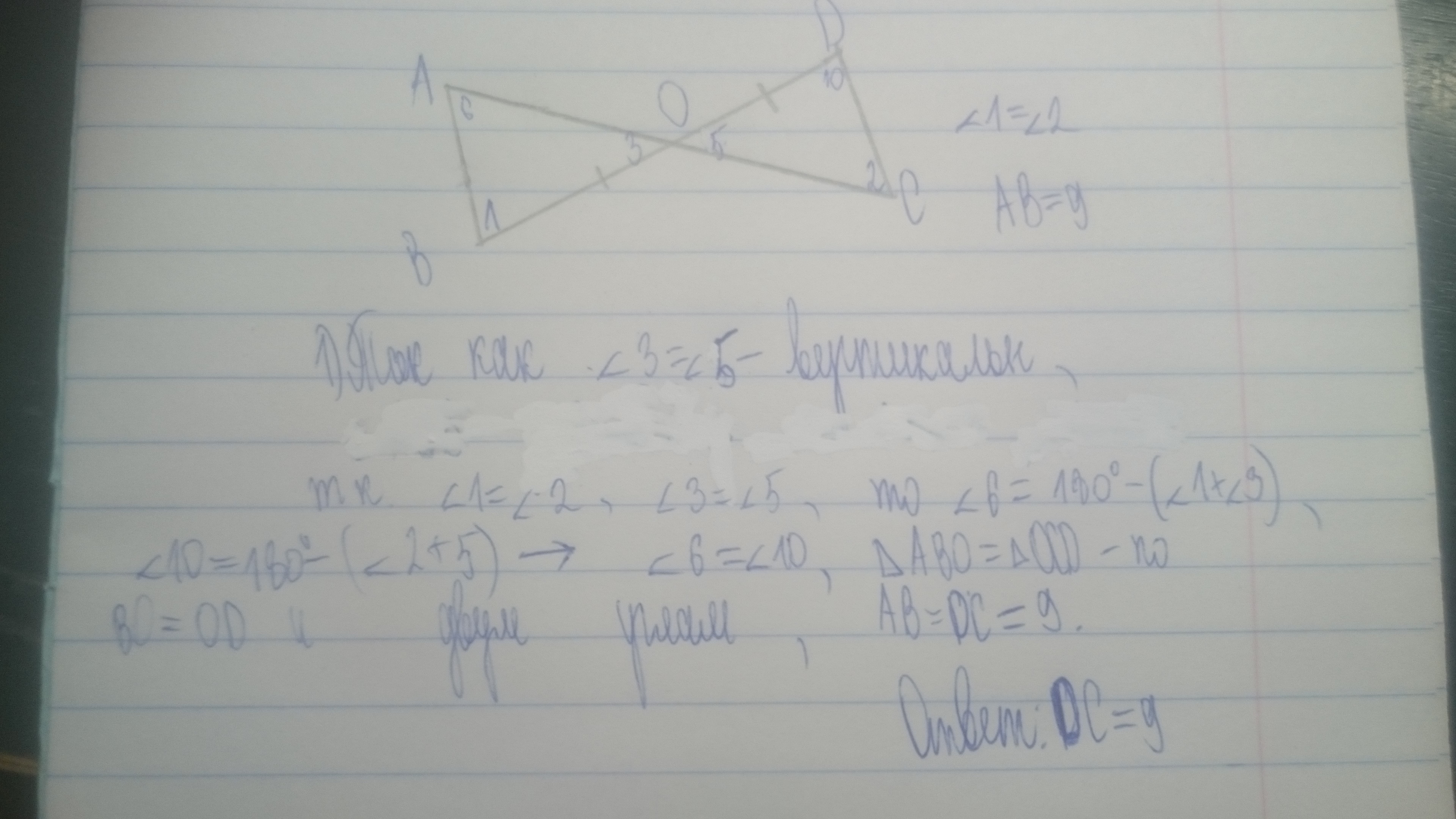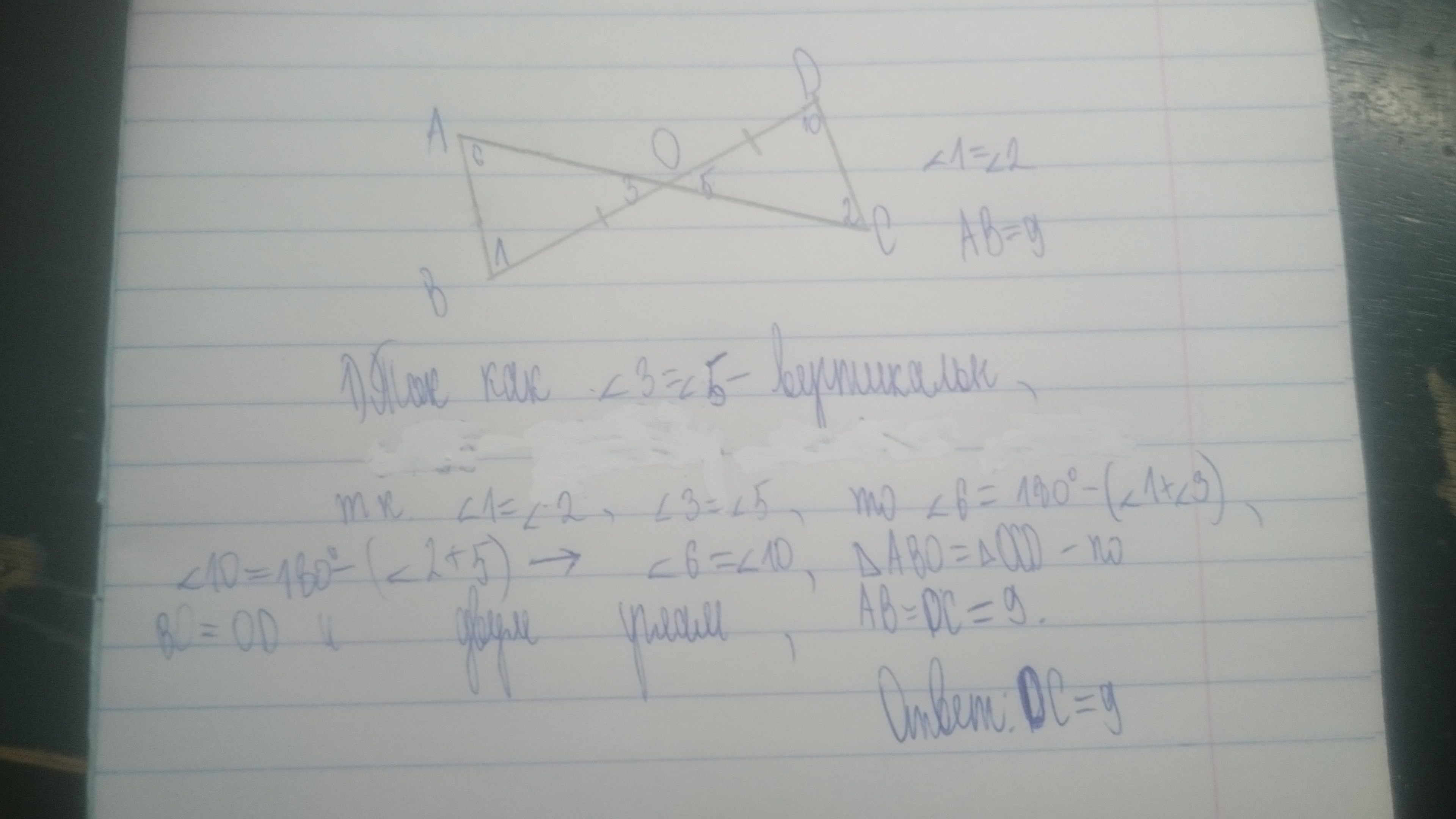 Отрезки AC и BD пересекаются в точке O так,что ABO=ДCO,BO=OD,AB=9см.Найти длину отрезка CD