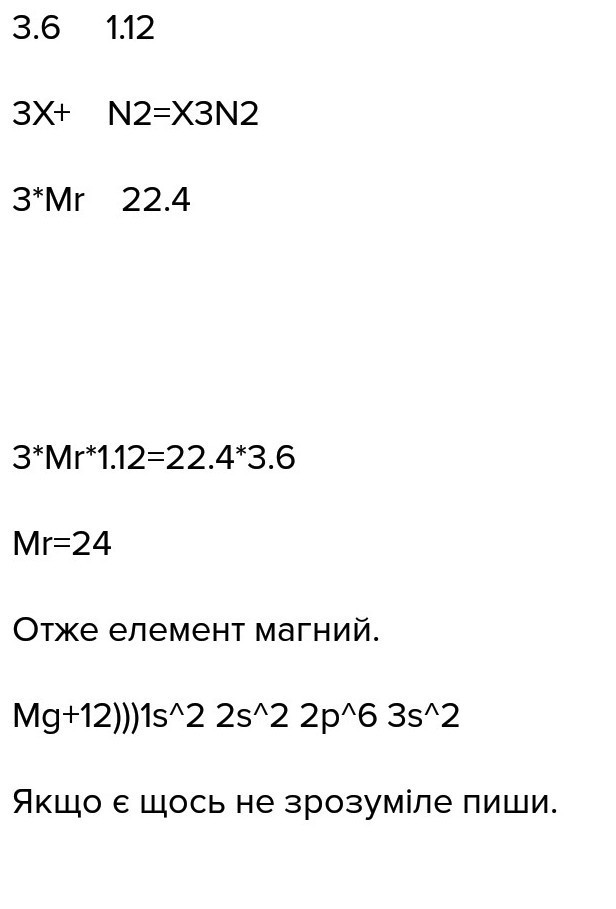 Елемент головної підгрупи II групи масою 3,6 г повністю прореагував під час нагрівання з азотом об'ємом 1,12 л (н. у.). Визначте цей елемент. Складіть схему будови атома, електронну формулу.