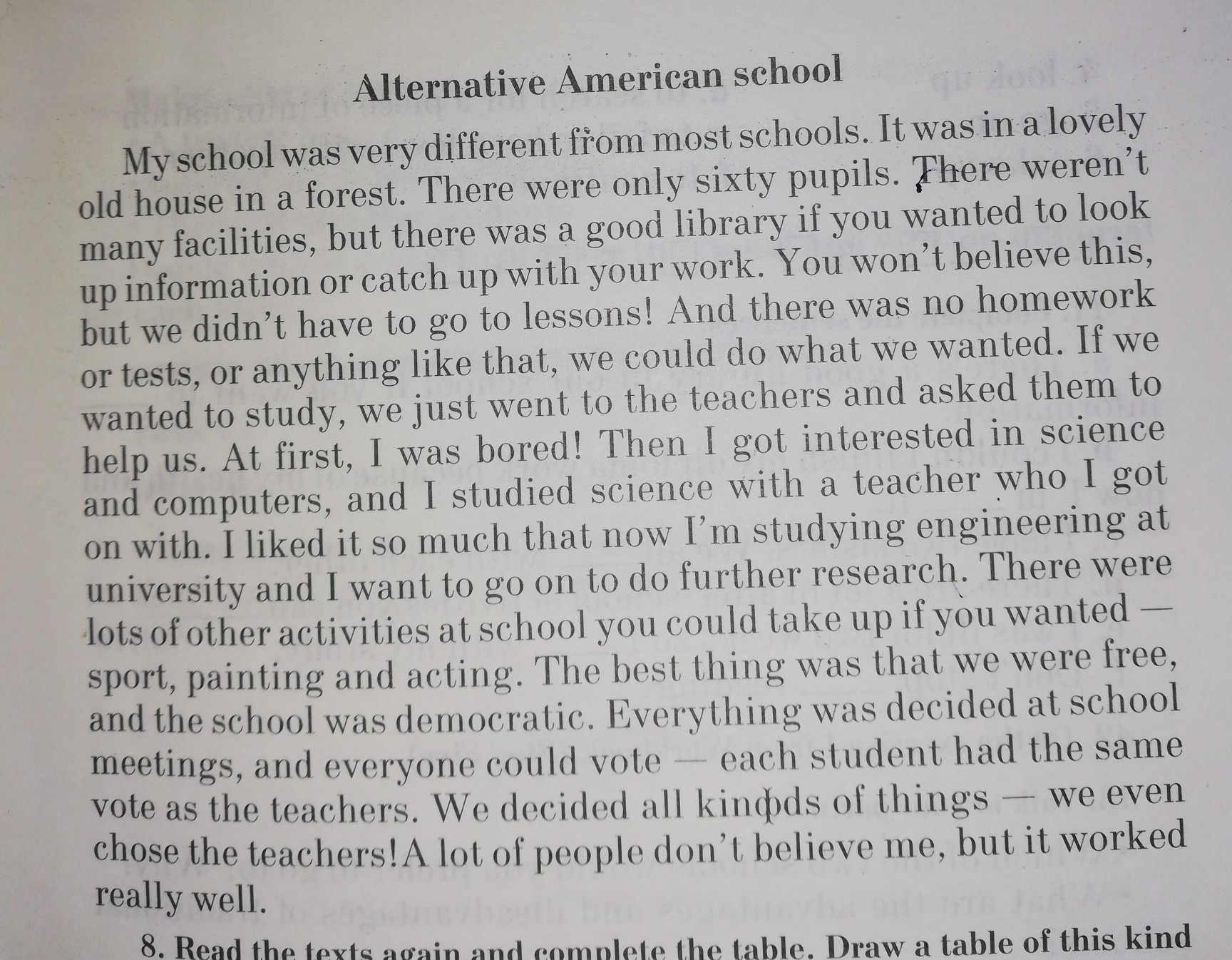 Моя школа очень отличалась от большинства школ. Она была в прекрасном старом доме в лесу . Там были только шестьдесят учеников. Там не было достаточно факультативов, но была хорошая библиотека, чтобы вы могли при желании найти информацию или дополнить свою работу. Вы не поверите, но мы не должны были ходить на уроки! И не было домашнего задания или тестов, или чего-нибудь подобного, мы могли делать то, что мы хотели. Если мы хотели учиться, мы просто шли к учителям и просили их помочь нам. Сначала мне было скучно! Потом я заинтересовался естествознанием и компьютерами, и я изучал естествознание с учителем, с которым я хорошо ладил. Мне это так понравилось, что теперь я учусь на инженера в университете, и я хочу продолжить исследования. Там были и другие занятия в школе, которыми вы могли бы воспользоваться, если бы вы захотели - это спорт, живопись и актерское мастерство. Самое лучшее было то, что мы были свободны, и школа была демократической. Все решалось на школьных собраниях, и каждый мог голосовать - каждый студент имел такой же голос, как у учителя. Мы решили все виды вопросов - мы даже выбирали учителя! Многие люди не верят мне, но это работало очень хорошо.