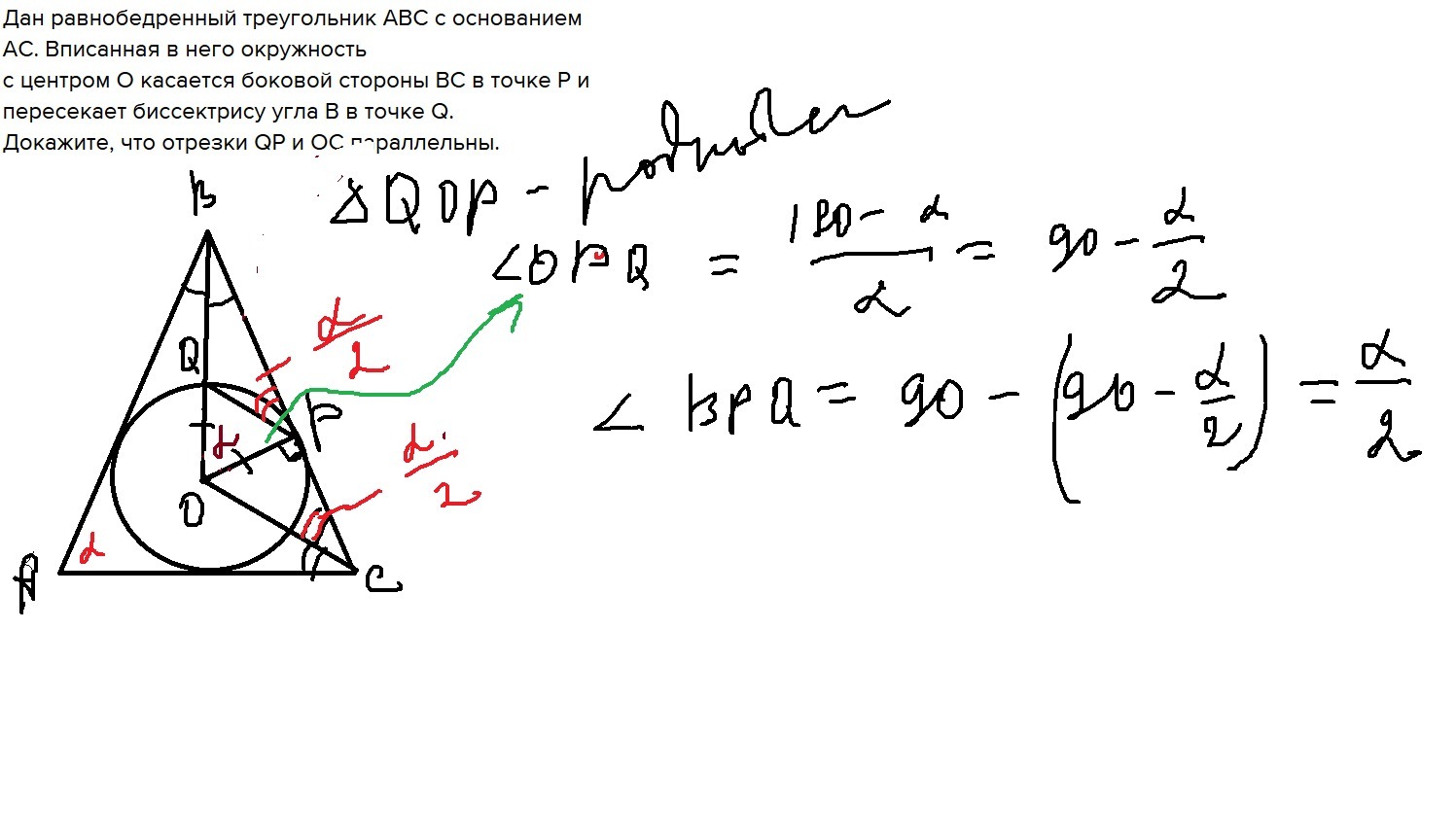 с центром О касается боковой стороны ВС в точке Р и пересекает биссектрису угла В в точке Q.