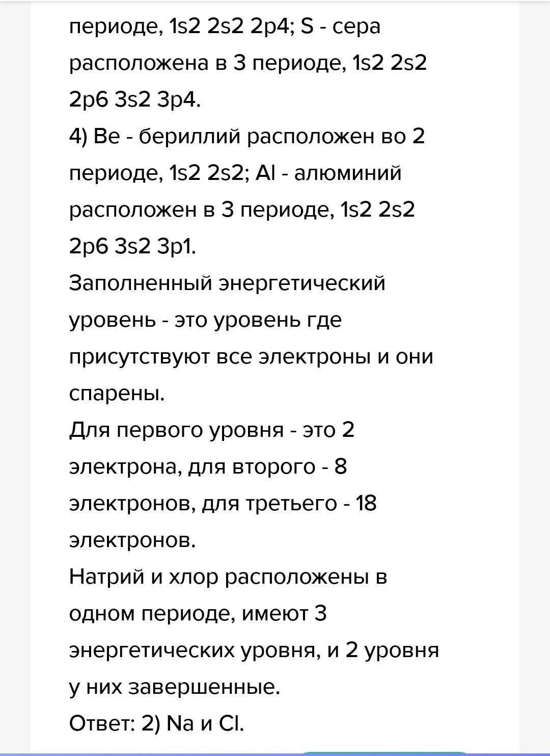 Какие два элемента имеют одинаковое число заполненных энергетических уровней? 1)He и Ne 2)Na и Cl 3)O и S 4)Be и Al Я
