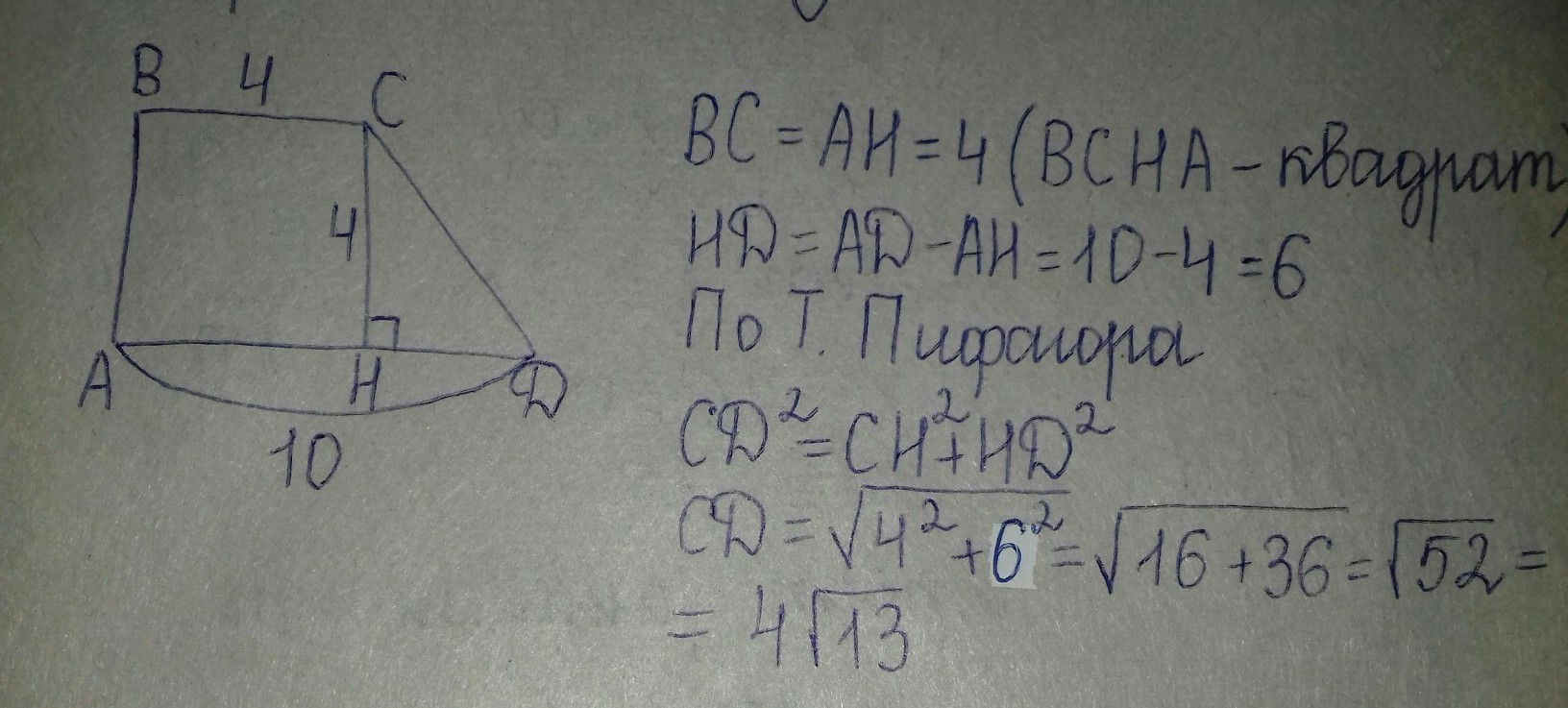 основание равнобедренного треугольной трапеции равны 10 и 4. высота равна 4. найдите боковую сторону.