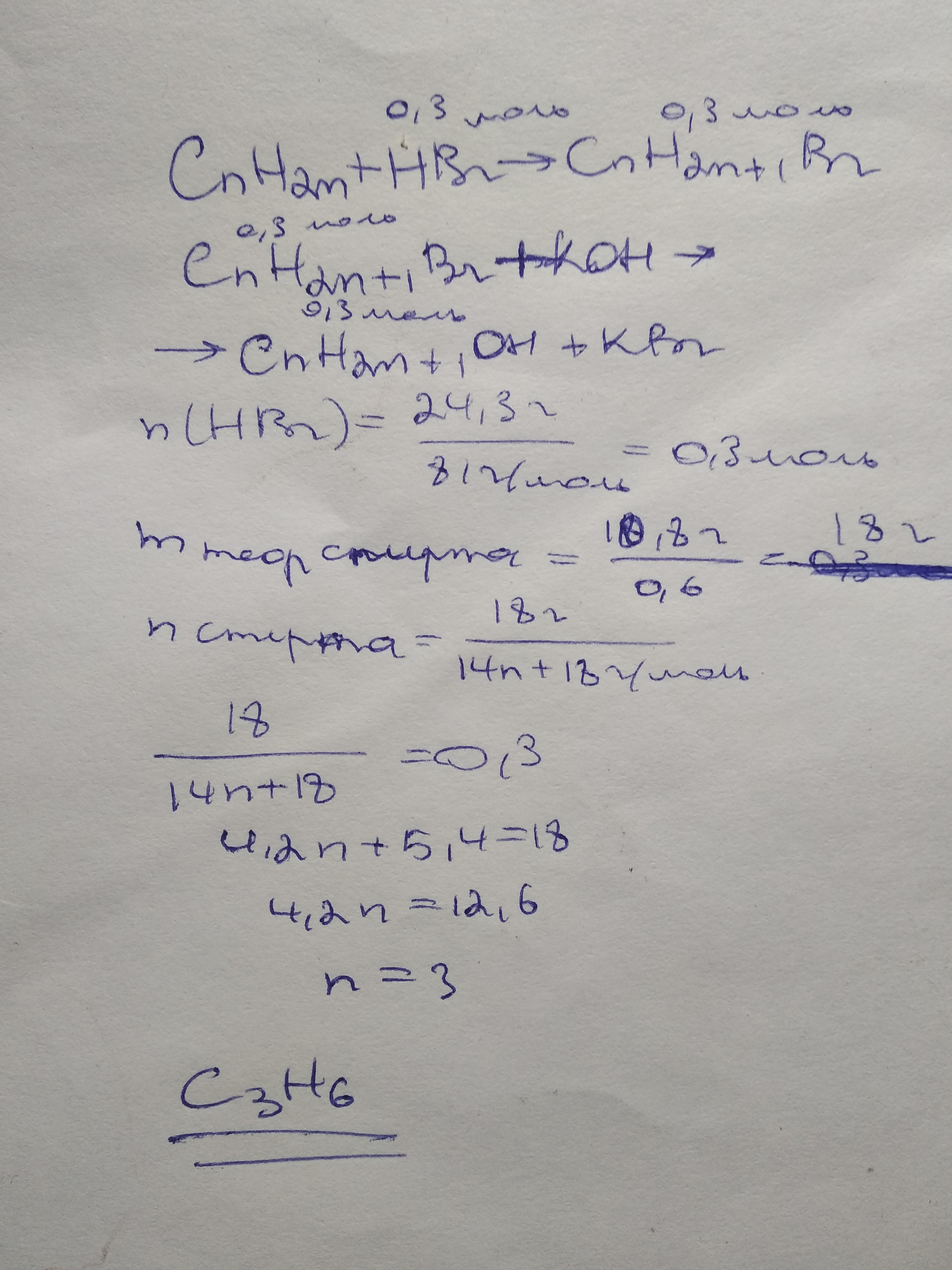 Алкен присоединяет 24,3 г бромоводорода. При взаимодействии продукта с водным раствором КОН получили с выходом 60% 10,8 г спирта. Какова формула алкена?