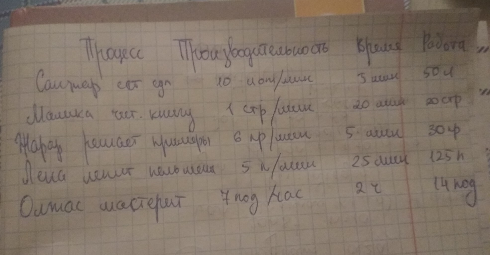 Процесс производительность время работа а)Санжар ест суп 10ложек/мин 5мин ? б)Малика читает книгу. ? 20мин 20стр в)Жанар решает примеры. 6примеров/мин ? 30примеров г) Лена лепит пельмени. 5пельмени/мин ? 125пельмени д)Олжас мастерит поделки . ? 2ч 14поделок