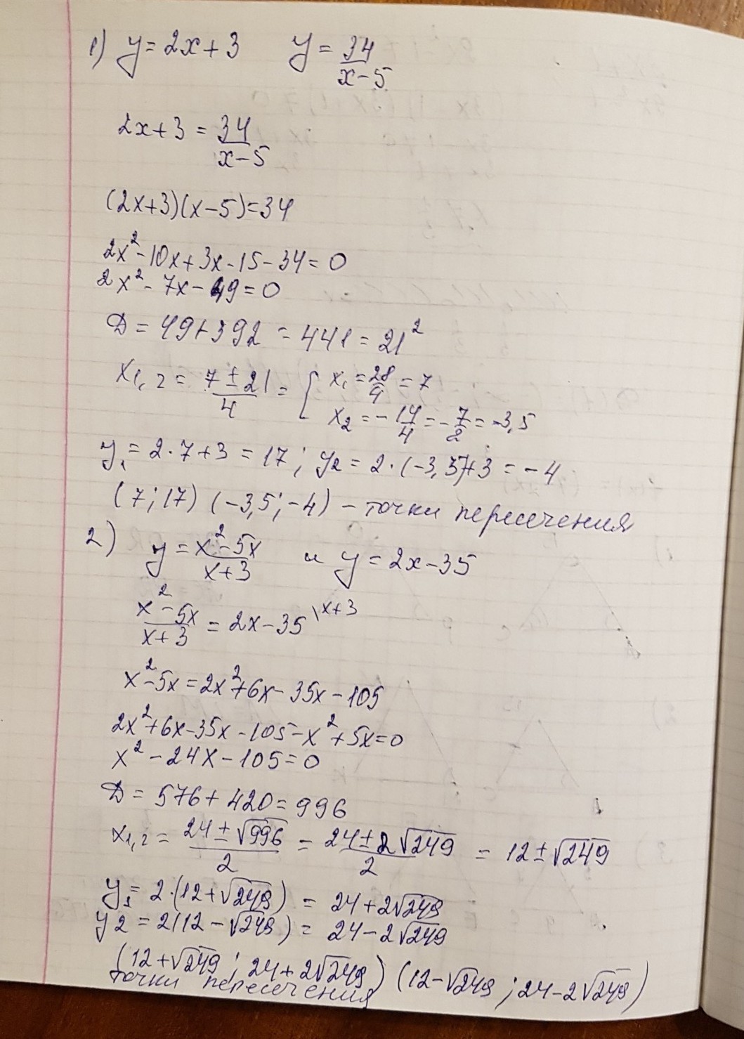 надо приравнять значения игреков,потом после нахождения значений икса,подставить в выражение любой функции и получить игрек.