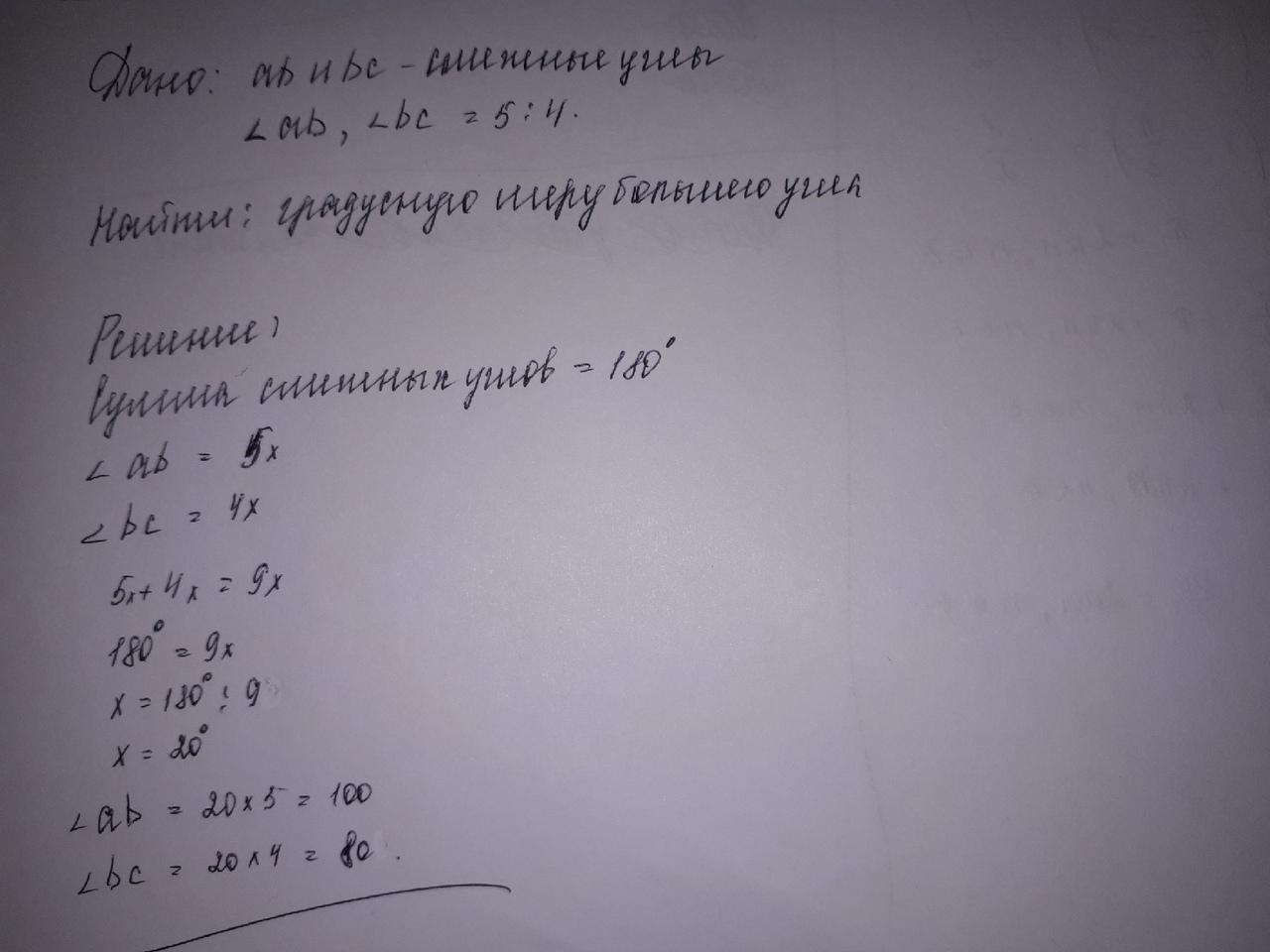 угол ab : угол bc = 5:4. В ответе запиши градусную меру большего угла.