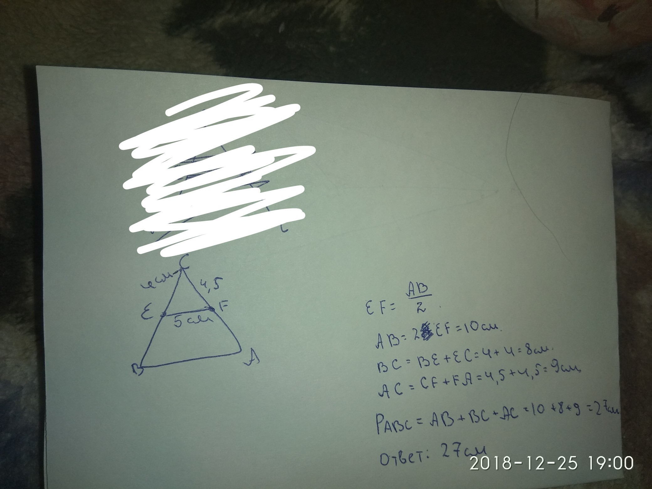 В треугольнике ABC, EF-средняя линия, точка Е лежит на стороне АС, а точка F- на стороне BC. ЕС=4см, FC=4.5 см, EF=5 см. Найдите P треугольника ABC