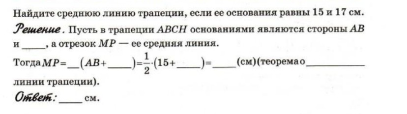 Тогда MP= 1/2*(AB+CH)=1/2*(15+17)= 16 (см) (теорема о средней линии трапеции)