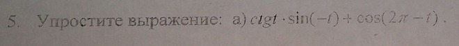 ctg t * sin(-t)+cos(2pi-t)=-(cos t / sin t) * sin t + cos t =-cos t + cos t = 0
