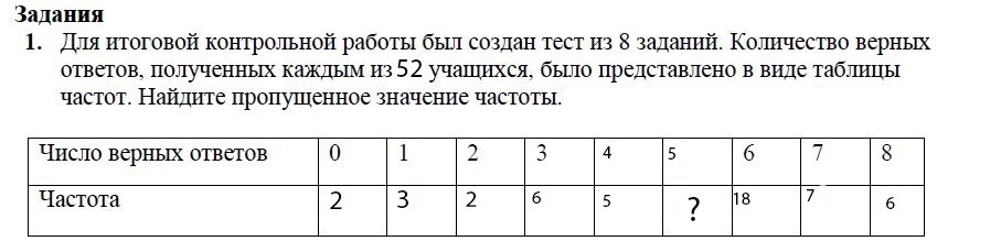 Для итоговой контрольной работы был создан тест из 8 заданий. Количество верных ответов, полученных каждым из 52 учащихся, было представлено в виде таблицы частот. Найдите пропущенное значение частоты.