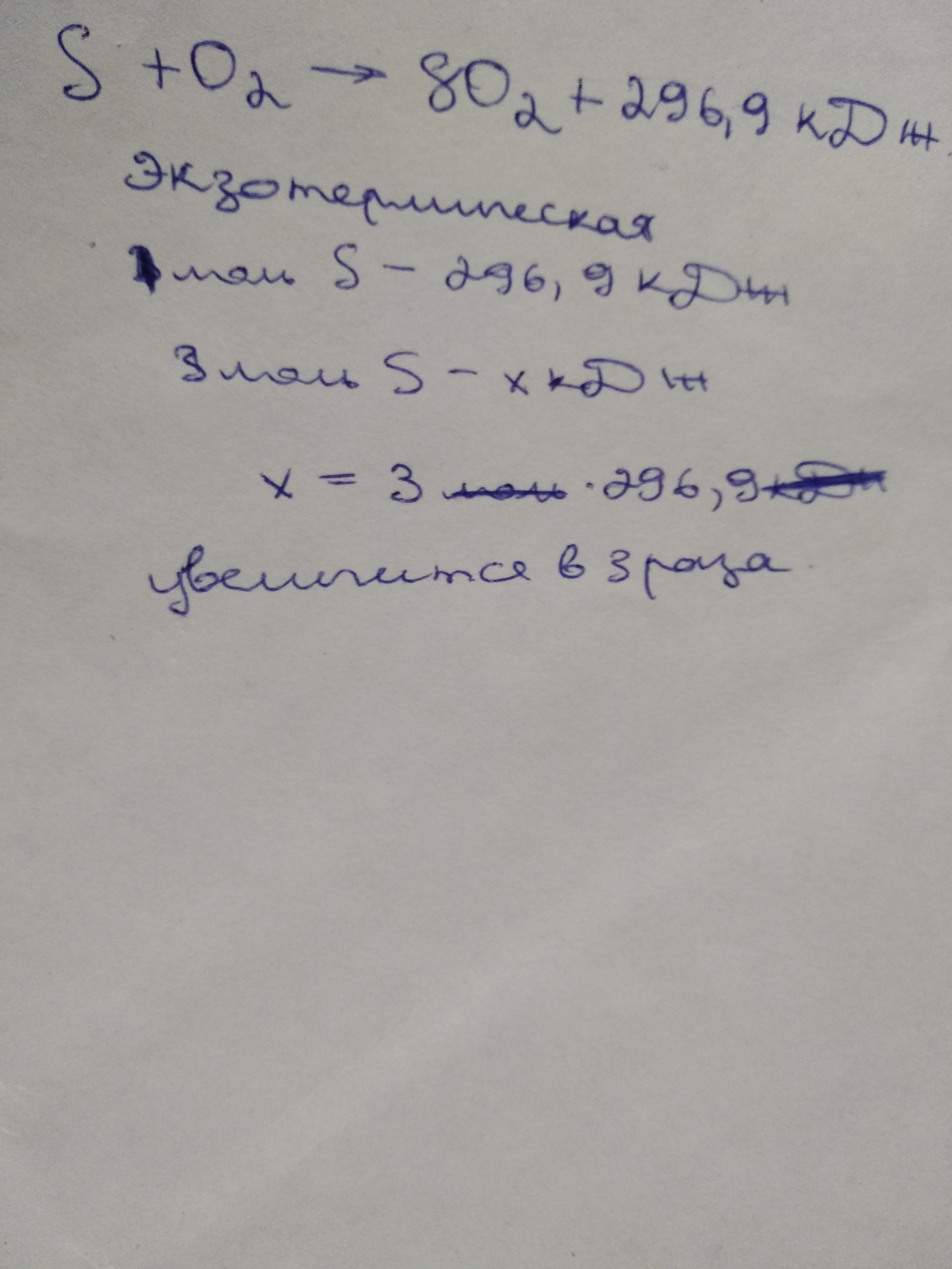 Тепловой эффект реакции горения 1 моль ромбической серы в избытке кислорода равен 296,9 кДж. Запишите термохимическое уравнение реакции. Какая это реакция: экзотермическая или эндотермическая? Во сколько раз и как измениться количество теплоты при сгорании 3 моль ромбической серы ?