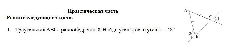 угол 1 равно углу С как вертикальные щначит оно равно 48 а угол С равен углу В потому что треугольник равнобедренный значит угол 2 равен 180-48=132 как смежные