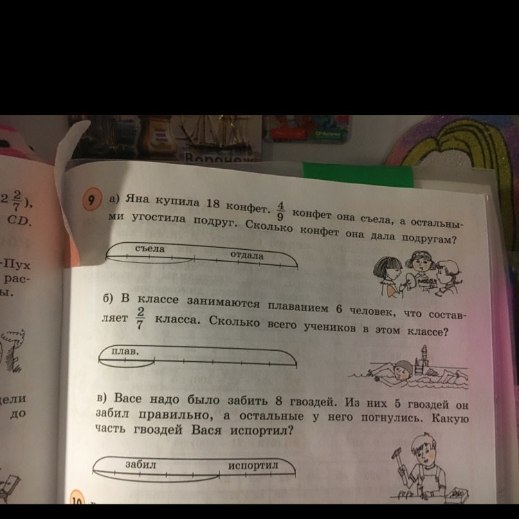 в)8 это целая часть 100%,1часть =1;8-5=3;значит 3/8 что полного количества гвоздей он испортил
