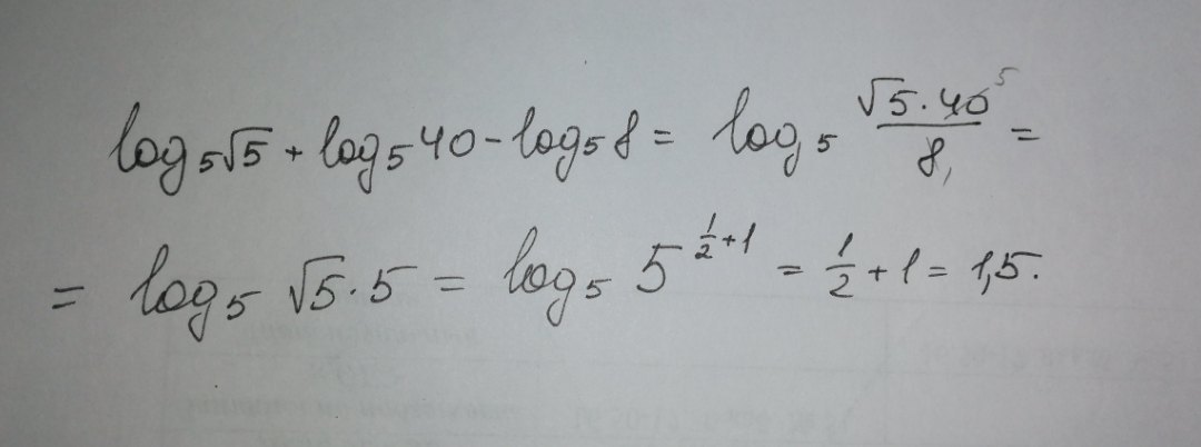 log(5) [√5*40/8] = log(5) √5*5 = log(5) 5^3/2 = 3/2*log(5) = 3/2*1 = 3/2 = 1,5.