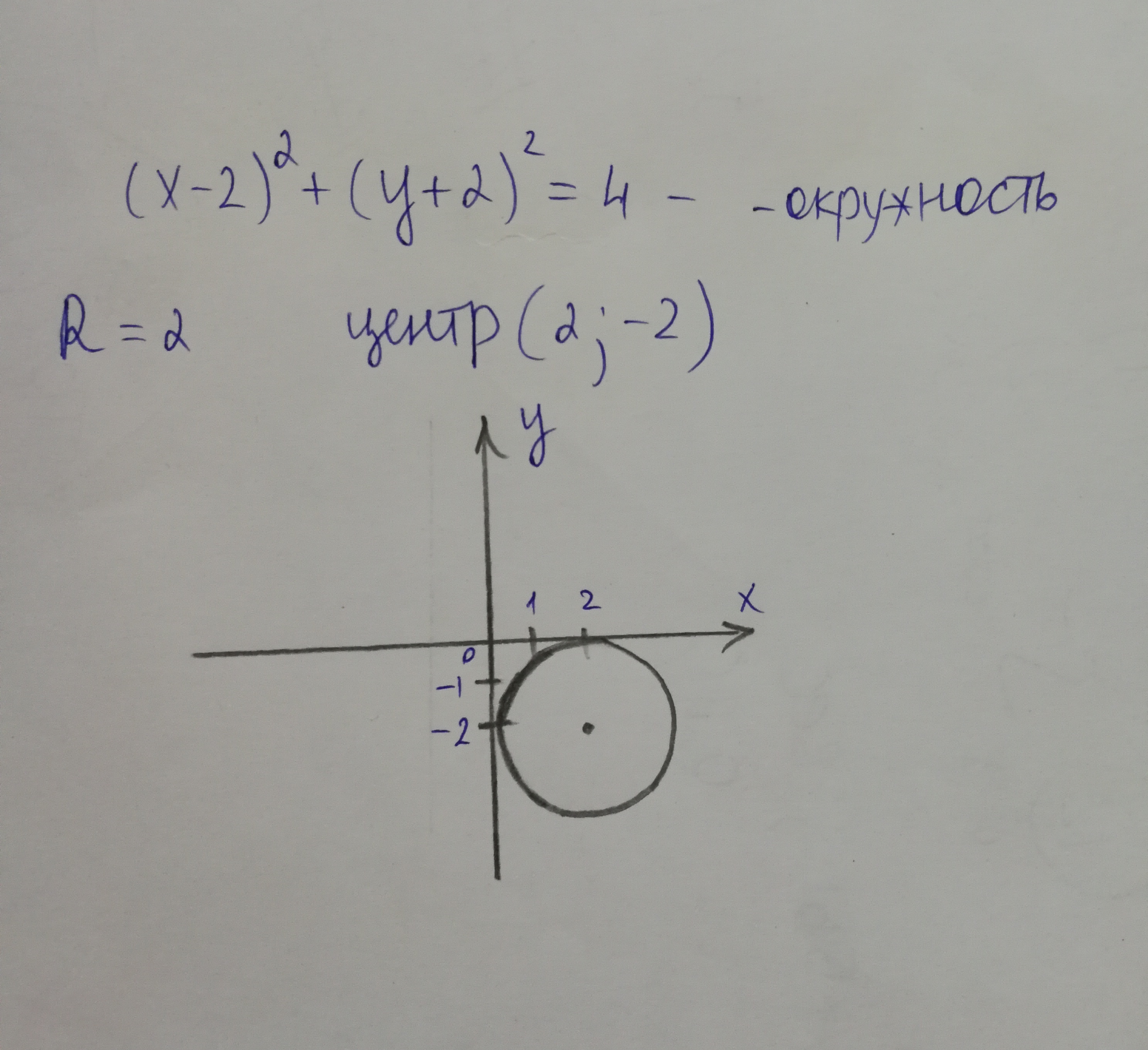 Возьми циркуль и на графике найди точку (2,-2) и это точка будет центром твоей окружности, а радиус равен 2.вот и все
