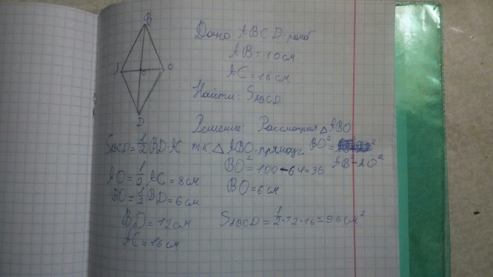Найдите площадь ромба, если его сторона равна 10 см, а одна из диагоналей равна 16 см.