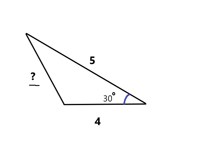 x² = 5² + 4² - 2 · 5 · 4 · sin30° = 25 + 16 - 40 · 1/2 = 41 - 20 = 21