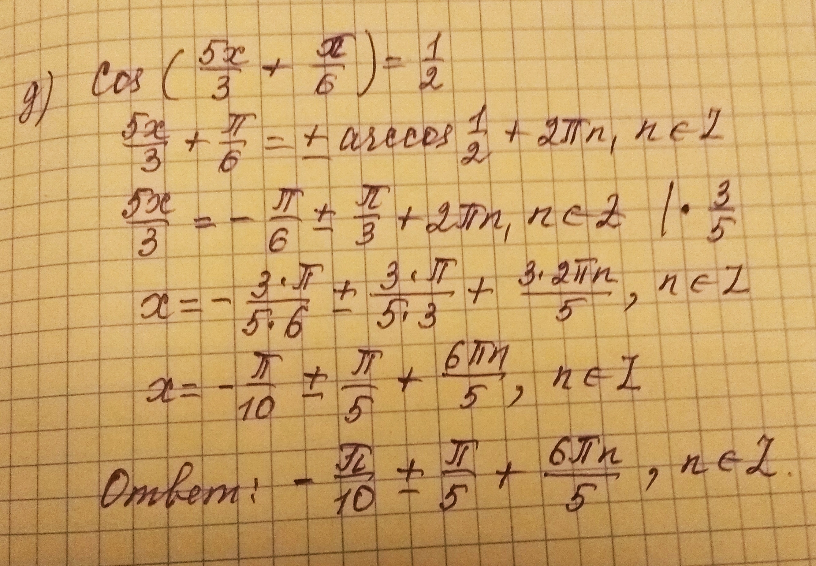 д)5x/3+pi/6=+-arccos(1/2)+2pin; n-целое