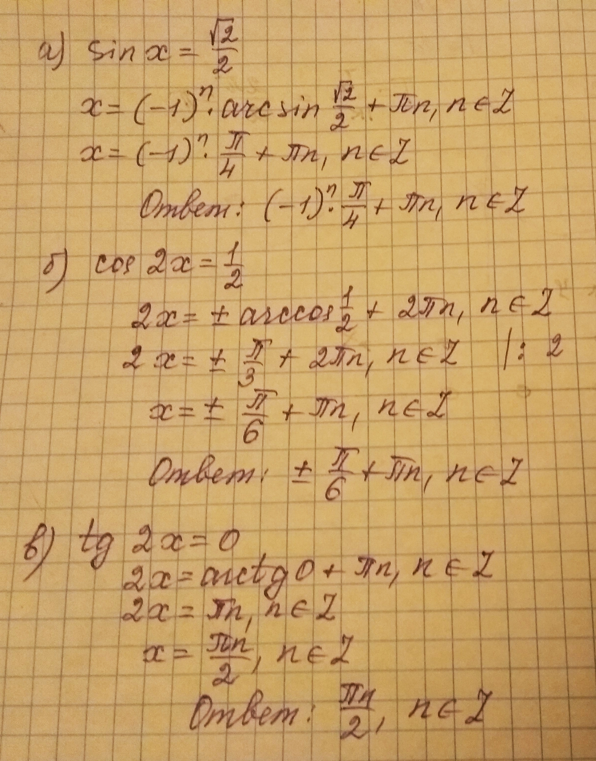 в)tg2x=0; 2x=arctg0+pik; 2x=0+pik=pik; x=pik/2