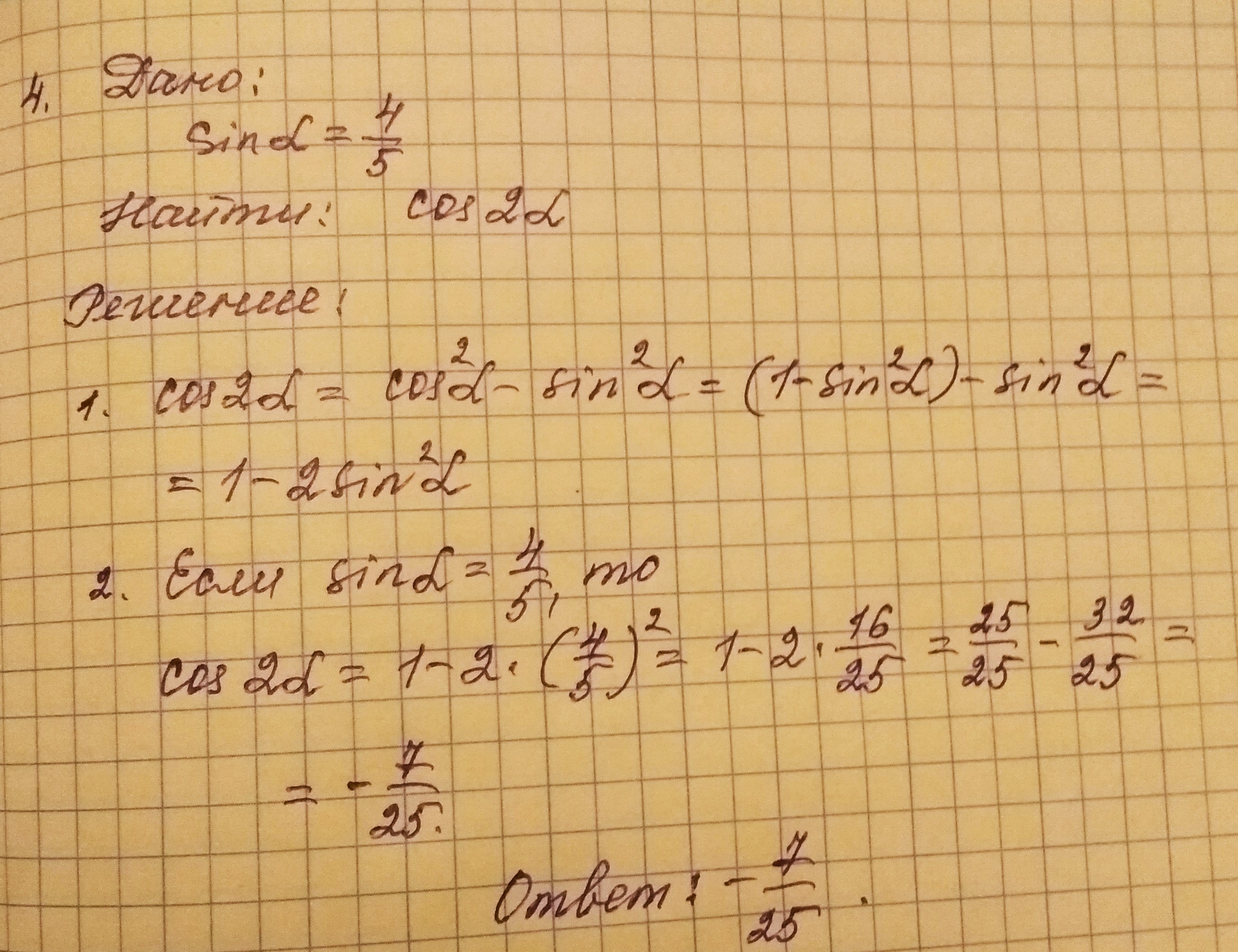 4)cos2a=1-2sin^2a=1-2*(4/5)^2=1-2*16/25=1-32/25=-7/25