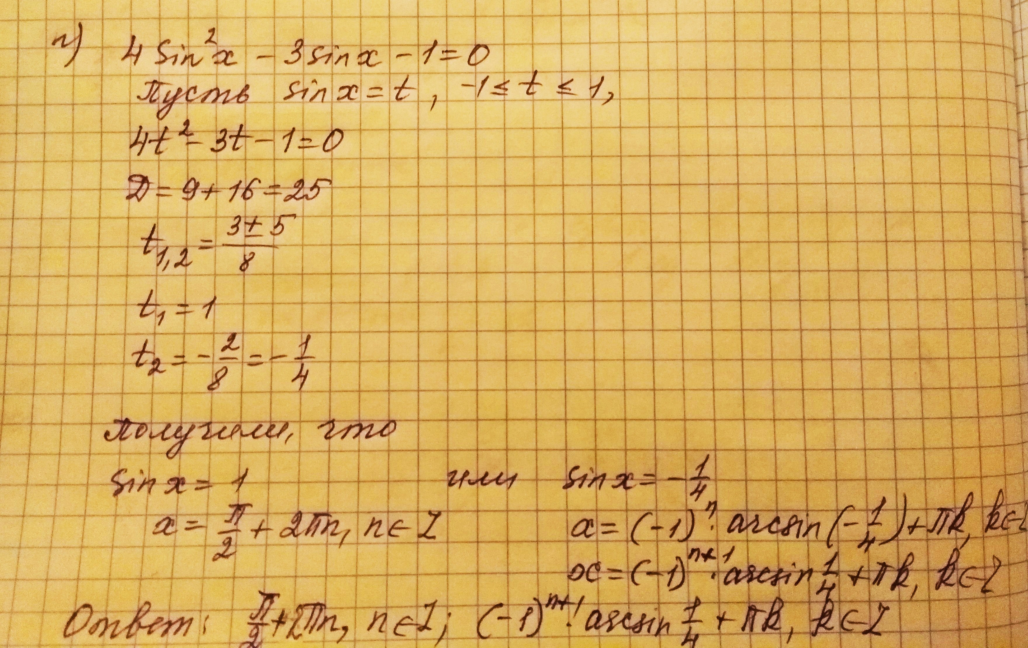 г)4sin^2x-3sinx-1=0; пусть sinx=t; 4t^2-3t-1=0;D=9+16=25
