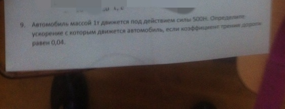 Автомобиль массой 1 тонну движется под действием силы 500h . Определелите ускорение с которым движется автомобиль если коэффициент трения дороги равен 0,04