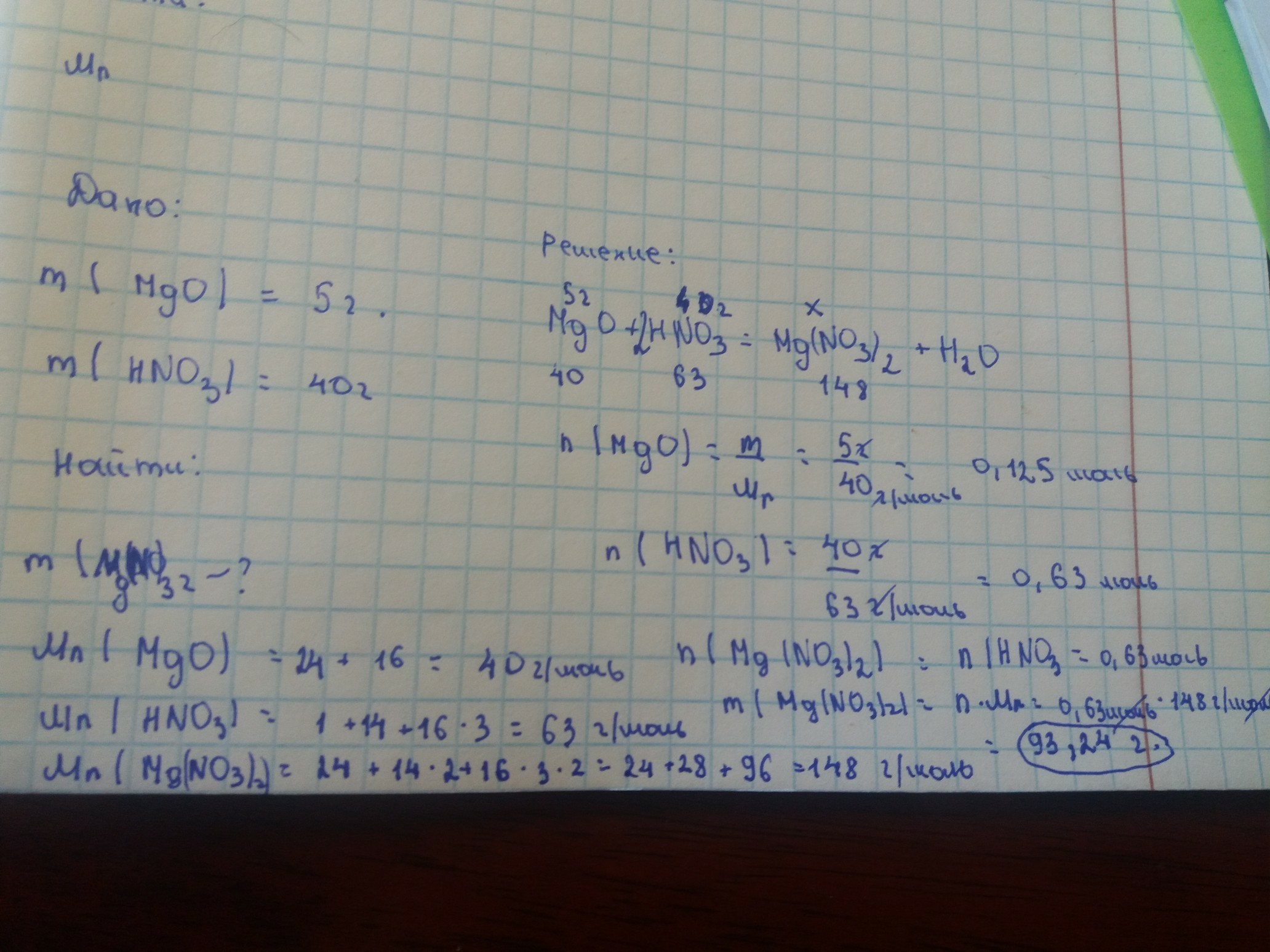 Определите массу соли образовавшейся при взаимодействии 5 Г оксида магния с 40 г азотной кислоты