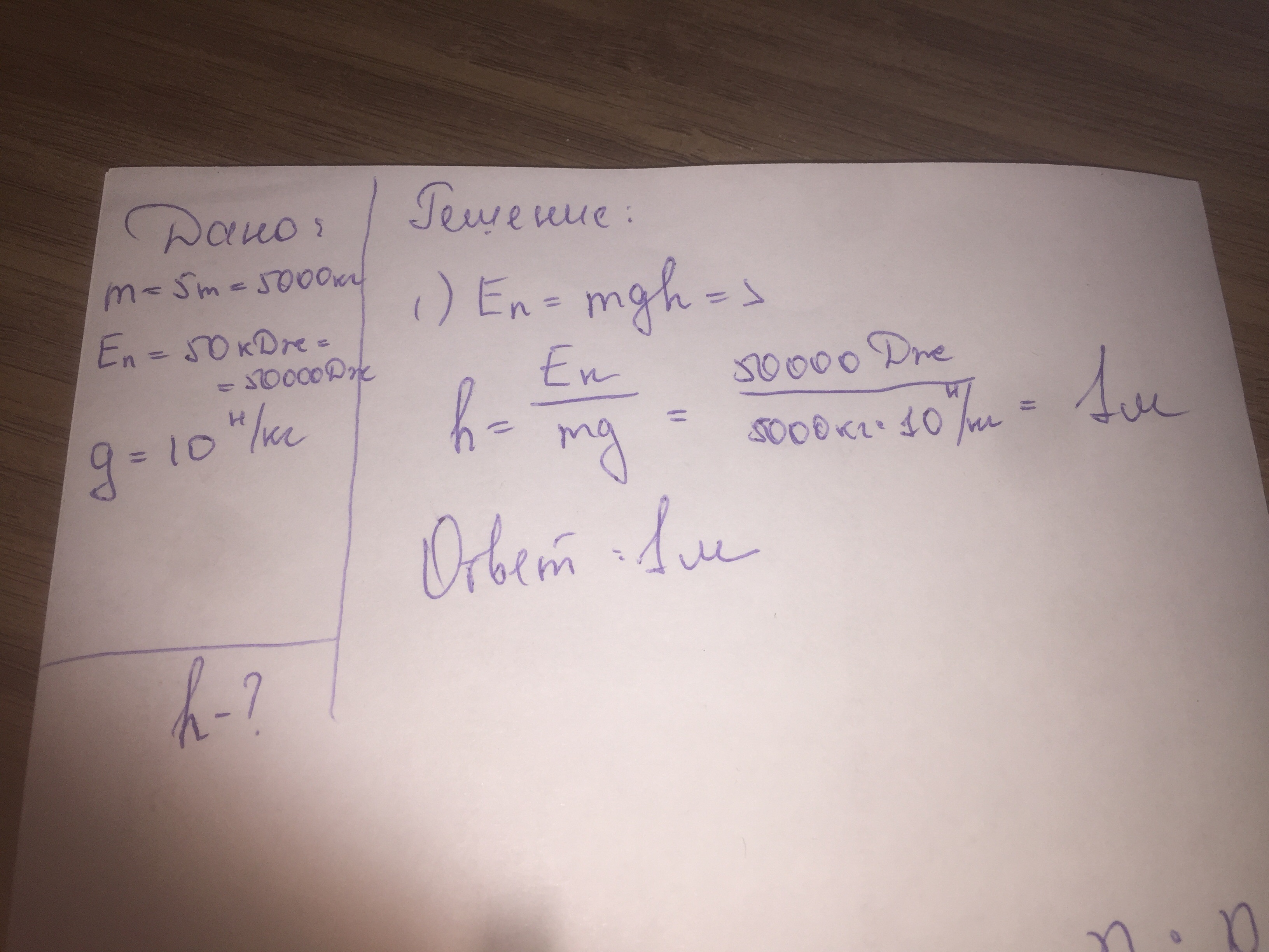 h=(50*10^3)/5*10^3*10=1м