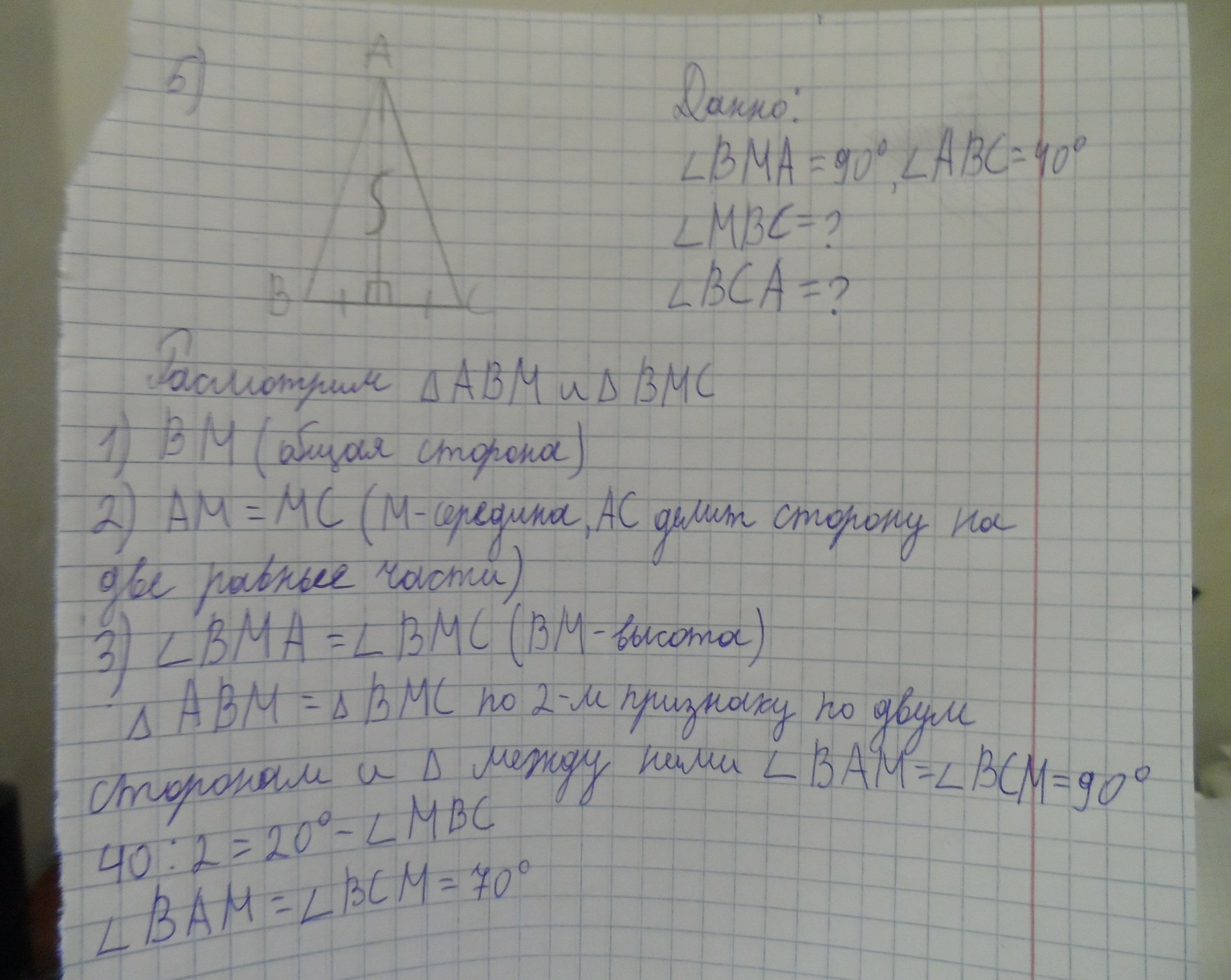 В треугольника АВС точка М середина стороны АС,угол ВМА=90°,угол АВС=40°,угол ВАМ=70°.Найдите углы МВС и ВСА,умоляю вассссссссссс помогитее пожалустааааааааааа