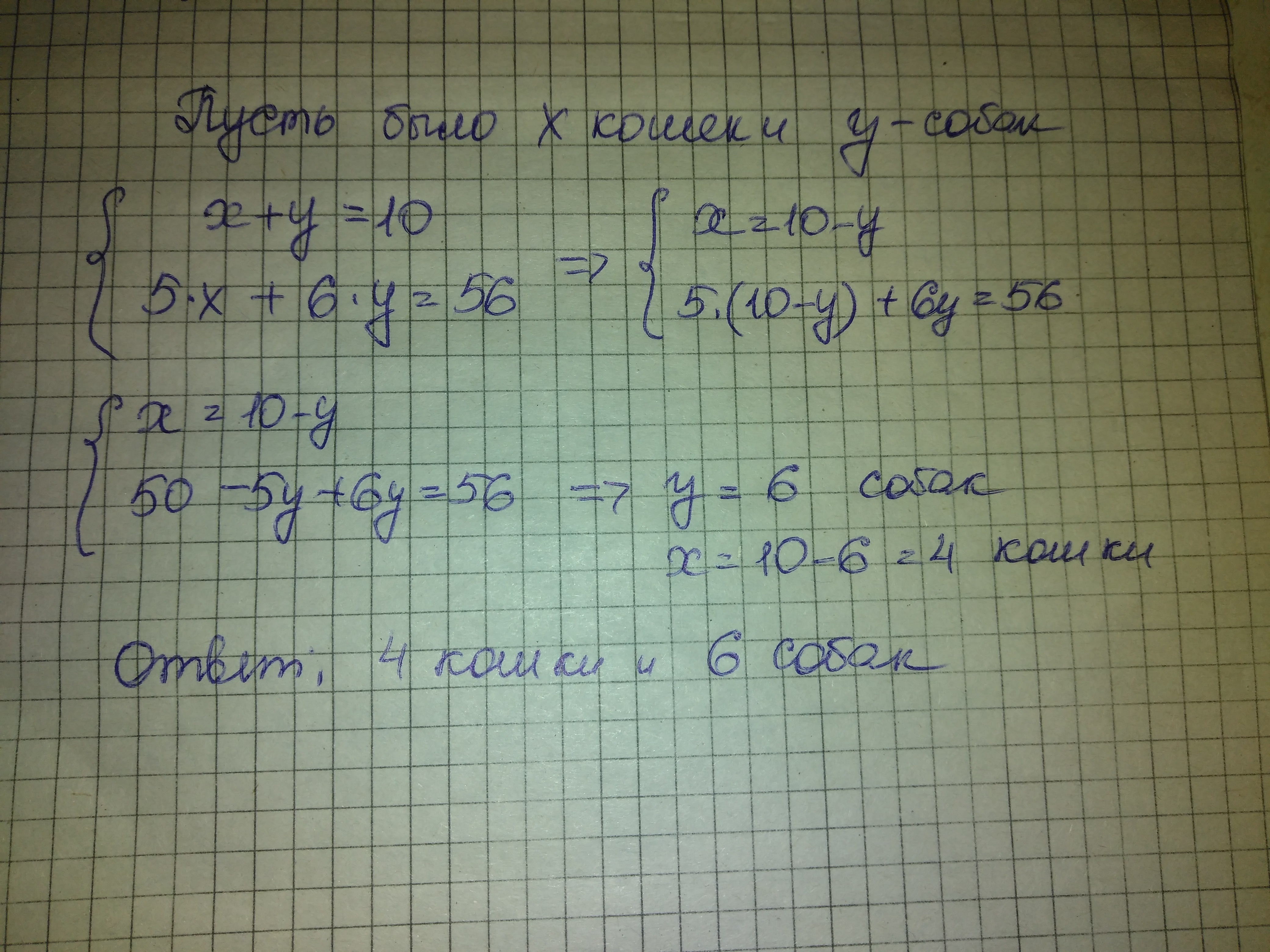 Одна старая леди очень любила собак и кошек. Всего у нее было десять питомцев. Однажды она решила накормить их всех конфетами, и раздала им 56 штук. При этом мы знаем, что каждой кошке она давала по пять конфет, а каждой собаке — по шесть. Сколько у нее было собак и сколько кошек?