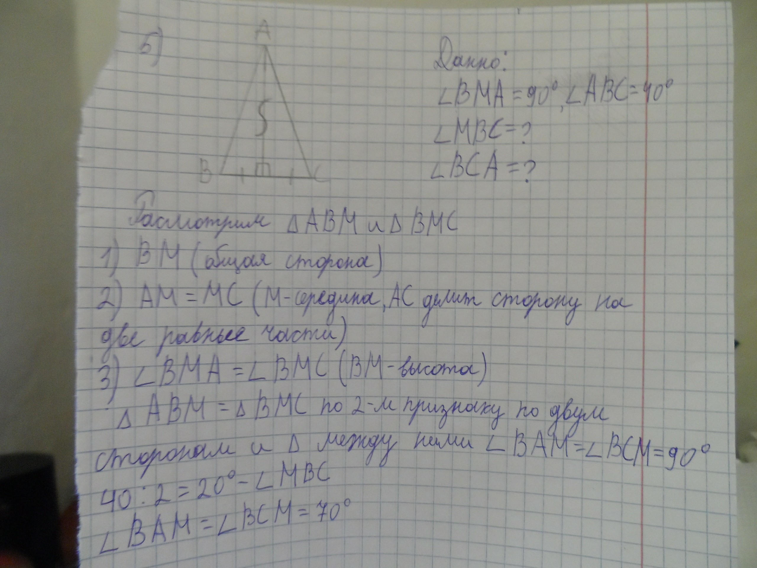В треугольника АВС точка М середина стороны АС,угол ВМА=90°,угол АВС=40°,угол ВАМ=70°.Найдите углы МВС и ВСА
