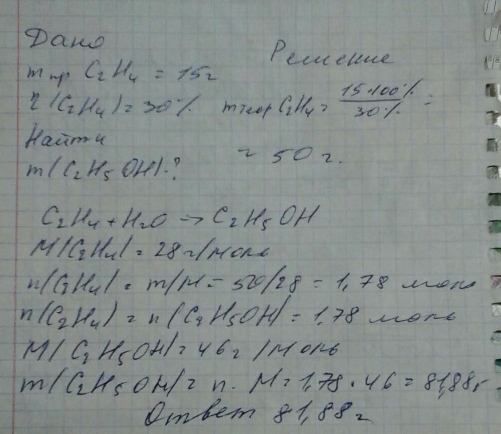 Рассчайте массу этилового спирта, который потребуется для получения 15г этена , если массовая доля выхода этена равна 30%