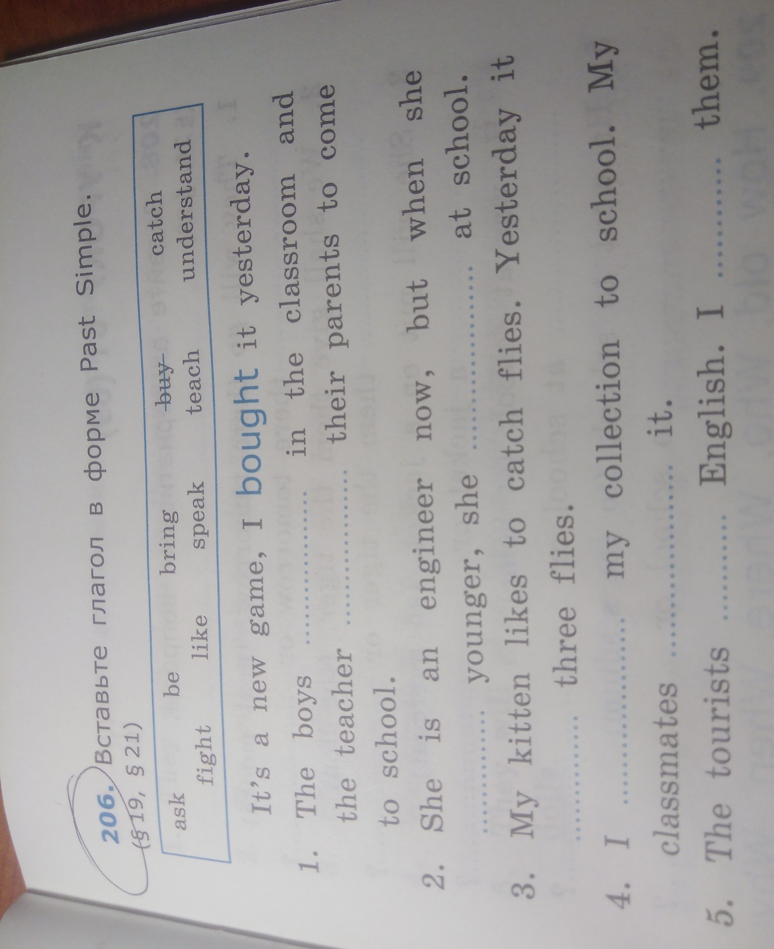 1 fought, asked 2 was, taught 3 caught 4 brought, liked 5 spoke, understood