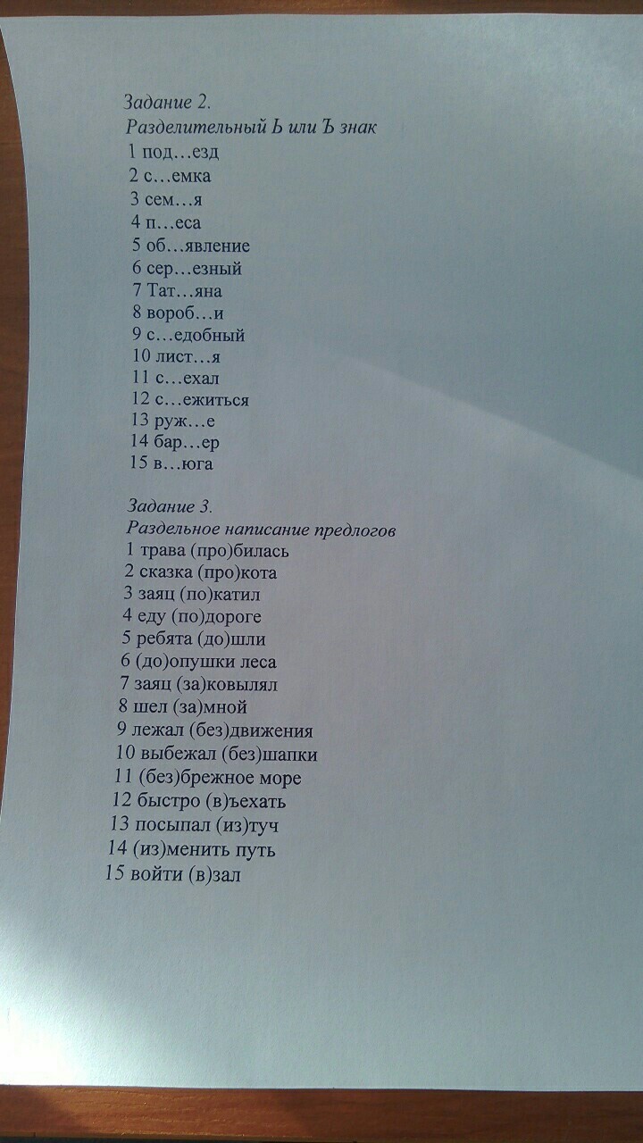 №2. 1-подъезд,2-съёмка,3-семья,4-пьеса,5-объявление,6-серьёзный,7-Татьяна,8-воробьи,9-съедобный,10-листья,11-съехал,12-съёжиться,13-ружьё,14-барьер,15-вьюга...№3. 1-трава пробилась,2-сказка про кота,3-заяц покатил,4-еду по дороге,5-ребята дошли,6-до опушки леса,7-заяц заковылял,8-шёл за мной,9-лежал без движения,10-выбежал без шапки,11-безбрежное море,12-быстро въехать,13-посыпал из туч,14-изменить путь,15-войти в зал.