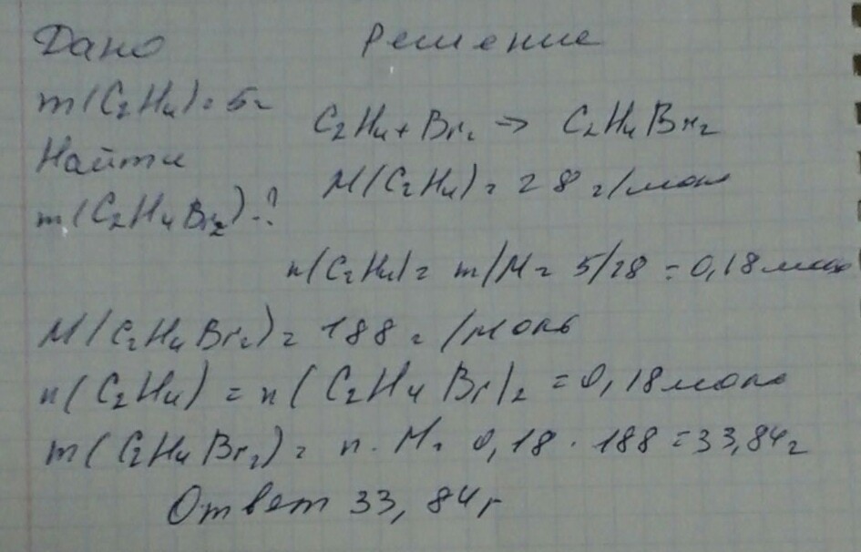 определить массу вещества, образующегося при взаимодействии этилена массой 5 г. с избытком брома