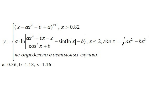 y:=a*ln(abs(((a*sqr(x)+b*x-z)/(sqr(cos(x))+b))-sin(ln(abs(x))-b)));