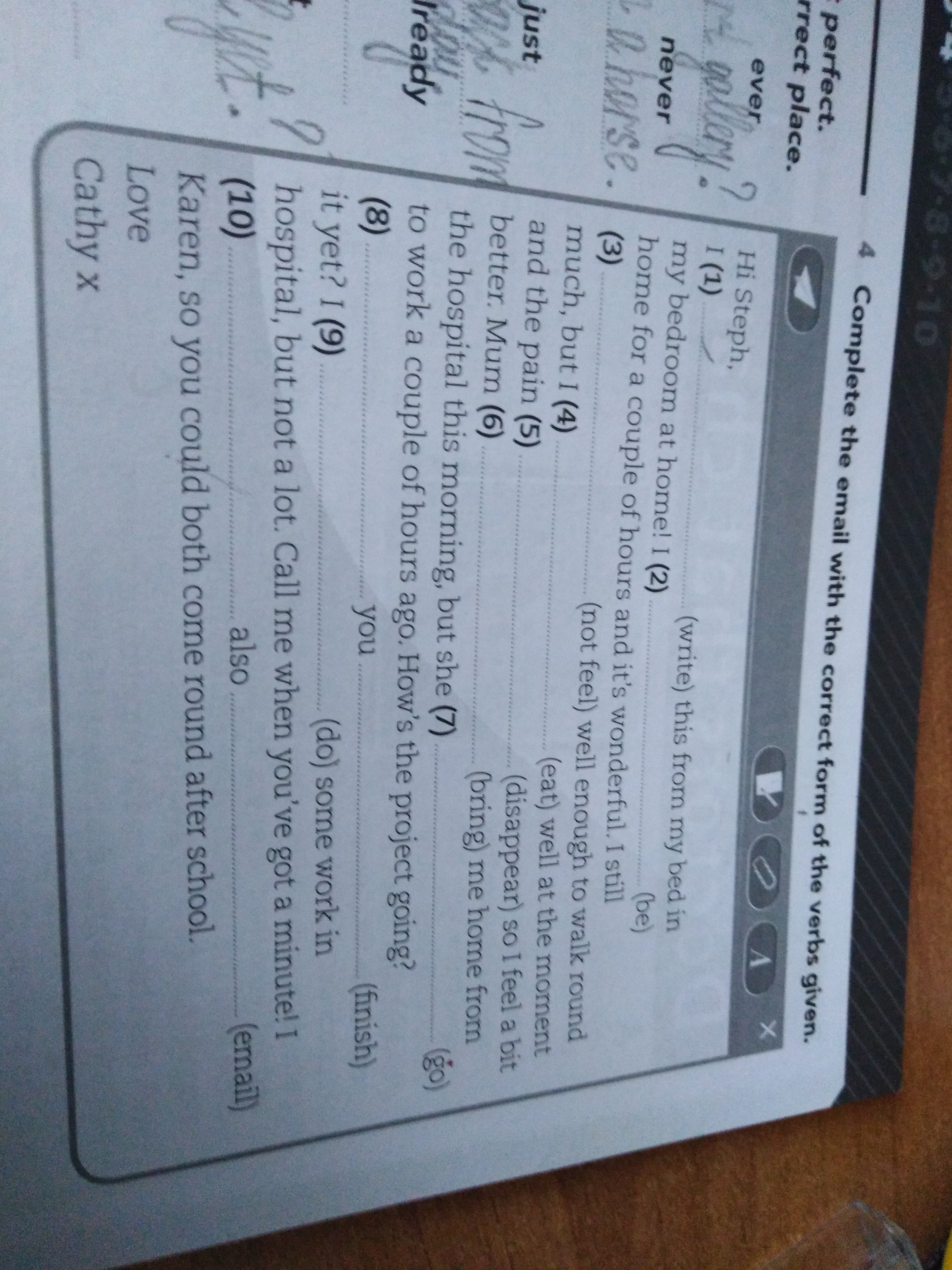 1 am writing 2 have been 3 do not feel 4 am eating 5 has disappeared 6 has brought 7 went 8 Have you finished 9 did 10 will also email