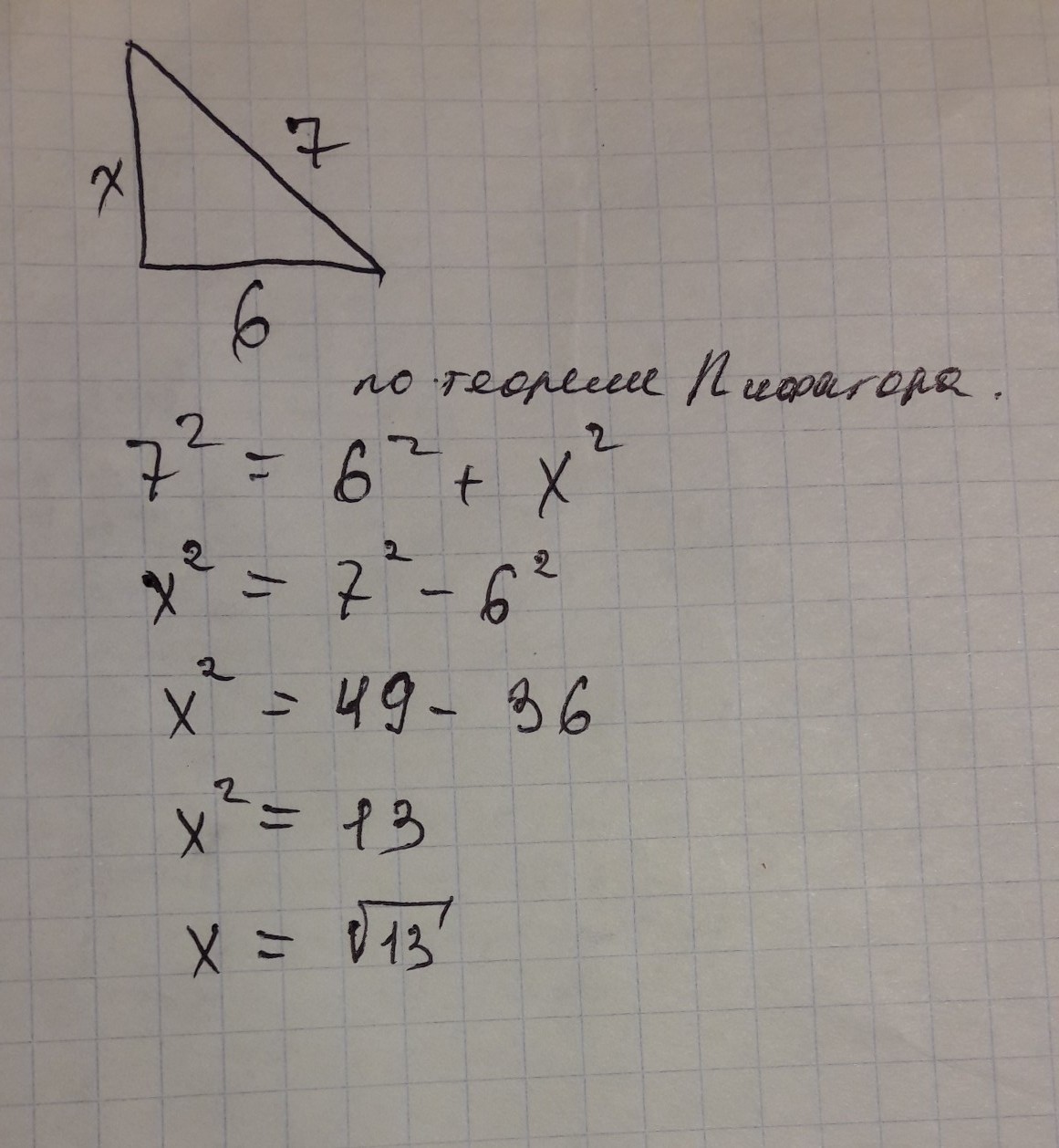 катет^2= 7^2-6^2=49-36=13