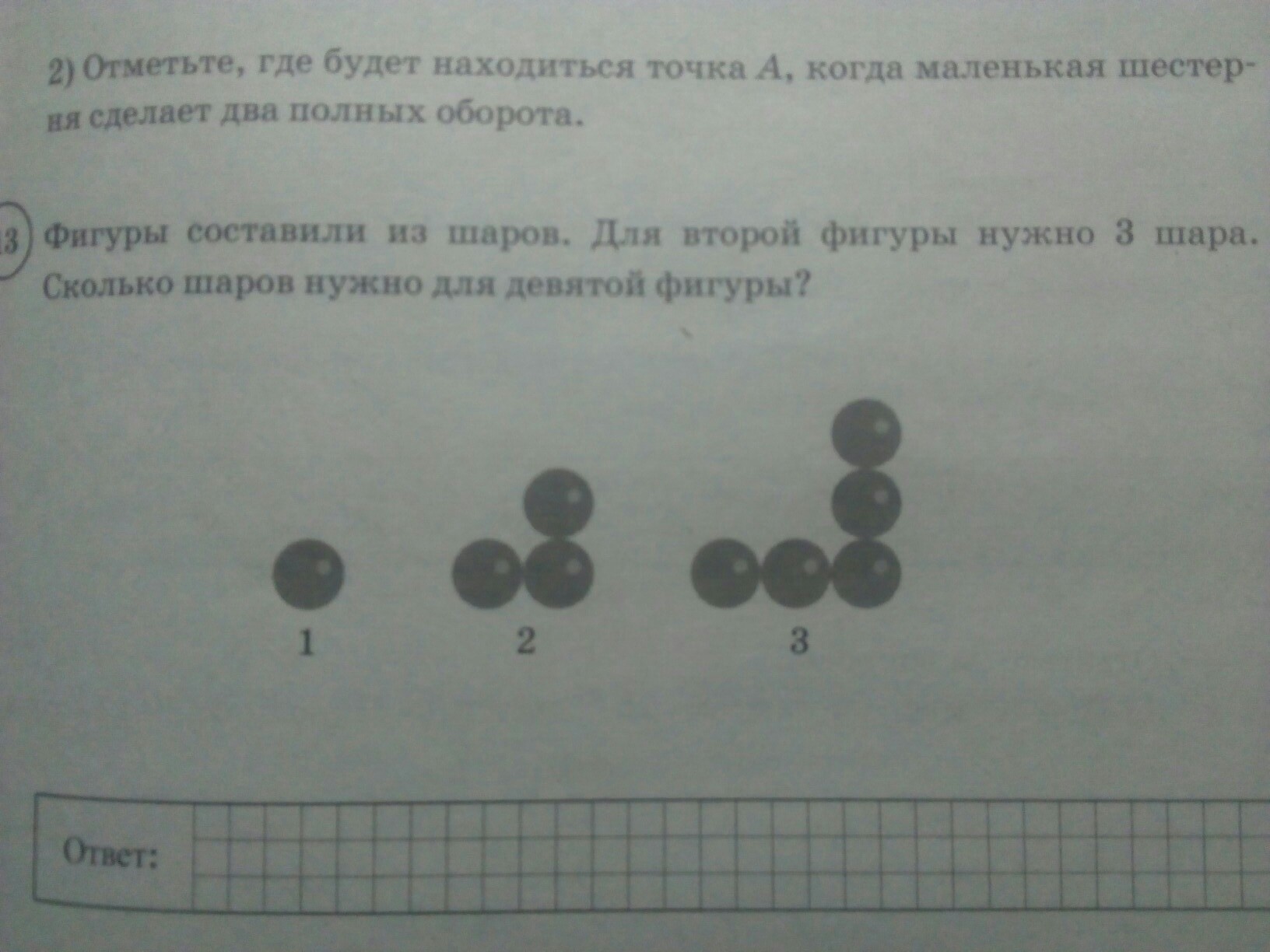Фигуры составили из шаров. Для второй фигуры нужно 3 шара. Сколько шаров нужно для девятой фигуры?