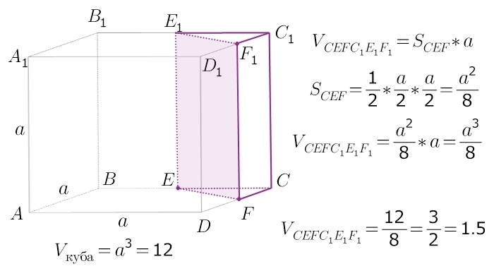 объем куба авсда1б1с1д1 равен 12.Построено сечение ЕFF1E1,проходящее через середины рёбер ВС,СD и С1D1 и параллельное ребру СС1.Найдите объем треугольной призмы СЕFC1E1F1