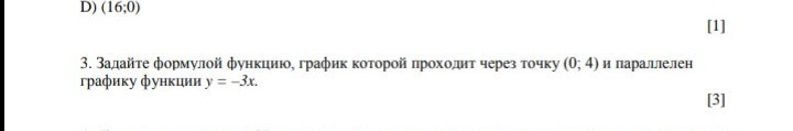 Т.к. по условию графики параллельны, то их угловые коэффициенты k равны, а т.к. график искомой функции проходит через точку (0; 4), то свободный член b искомой функции равен 4. Таким образом, формула y=kx+b примет вид: y= -3x+4.