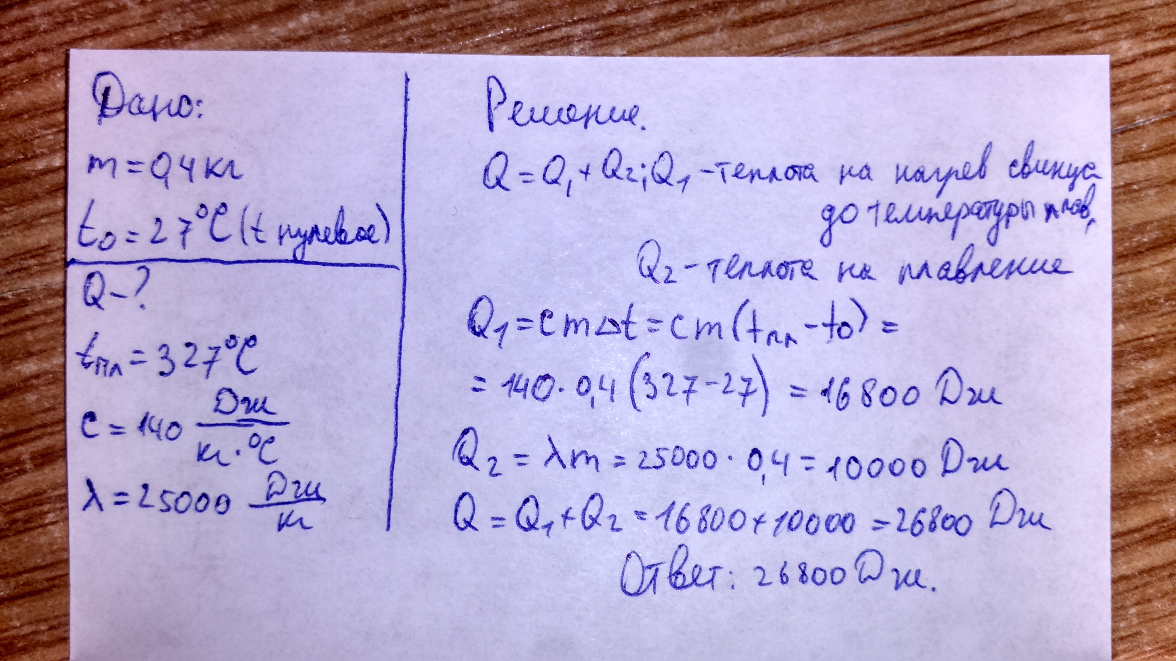 Q = (140 Дж /кг * °C * (327 °C - 17 °C) + 25 *103 Дж / кг) * 0,4 кг = 27360 Дж.