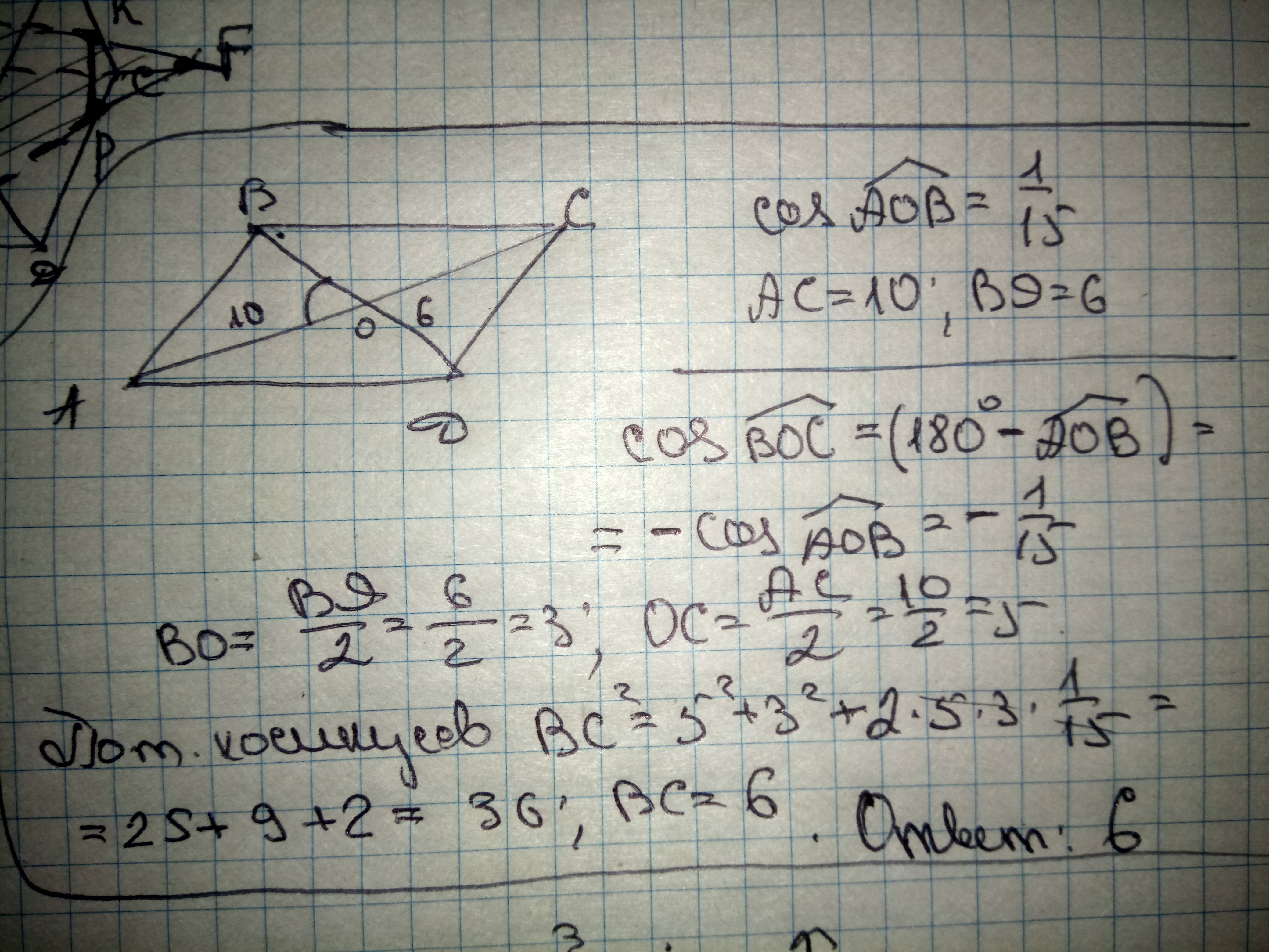 найдите большую сторону параллелограмма если его диагонали равны 10 и 6 а косинус угла между ними равен 1/15